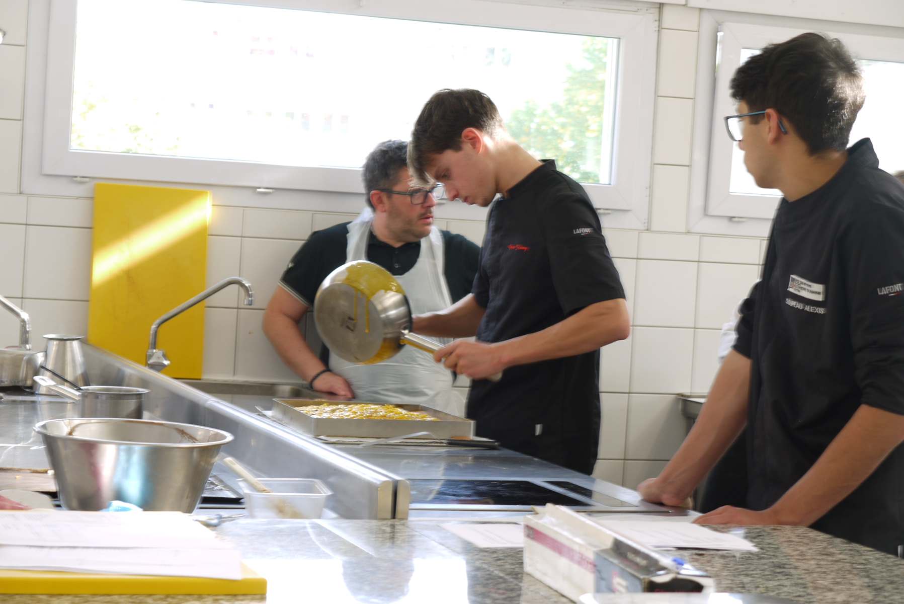 Ces journées de formations sont à l’initiative de Francois Helloco, commercial chez Valrhona. Après un temps d’accueil, la formation a pu débuter à 9 heures. Divisés en deux groupes, les 12 élèves se sont réparti les tâches entre eux pour réaliser la recette proposée après un premier brief. Le matin est au coeur des préparations tandis que l’après midi est consacrée aux finitions. À midi, le repas du lycée était proposé à l’ensemble des personnes présentes à la formation. Si en début de journée, les professionnels en formation restaient encore assez discrets et appréhensifs, au fil de la journée la tension de la formation se relâche avec cet esprit convivial.