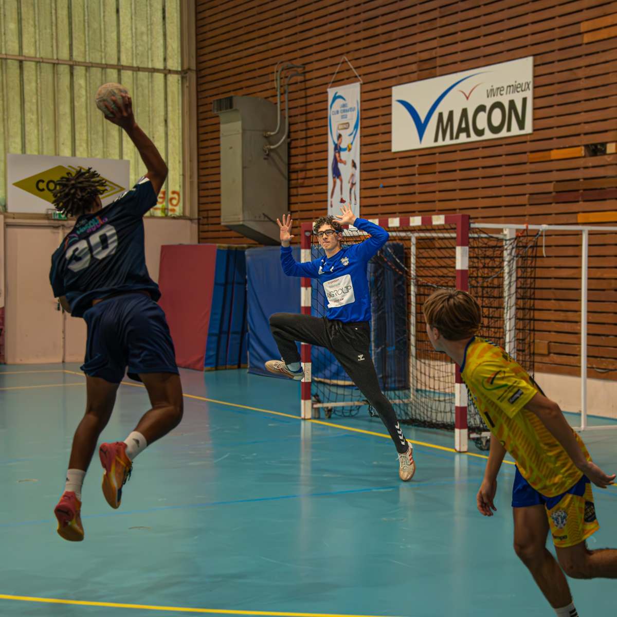 Ce fut ensuite le tour des garçons d'entrer sur le terrain. Vesoul avait fait le déplacement avec l'équipe réserve d'une Nationale 1 Élite, et qui redescend cette saison de Nationale 3. Bien décidés à remonter dès cette année, les visiteurs, habitués à marquer plus de 30 buts par match, affichaient dès le début de partie une certaine envie d'en découdre avec Mâcon. Mais c'était sans compter sur une défense mâconnaise qui est restée appliquée durant toute la 1ère période.