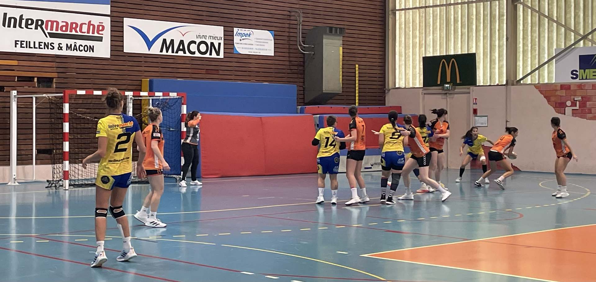 Les filles recevaient leurs homologues de Varois-Arc qui étaient, avant le match, invaincues et 1ères de la Poule. Malgré un 1er but adverse, les visiteuses n'ont jamais réellement réussi à déployer leur jeu. Le 1er but mâconnais de Noelly Chevallier ouvrait la voie d'une série de points emmenée par Manon Sanguy auteur de 12 buts. Les replis défensifs laissent les Dijonnaises dans l'incapacité de réagir. Les Jaunes et Bleues l'emportent 30 à 21 (MT 16-6) et se positionnent à la 2ème place du Championnat Prénational, derrière Buxy que Mâcon ira défier samedi prochain.