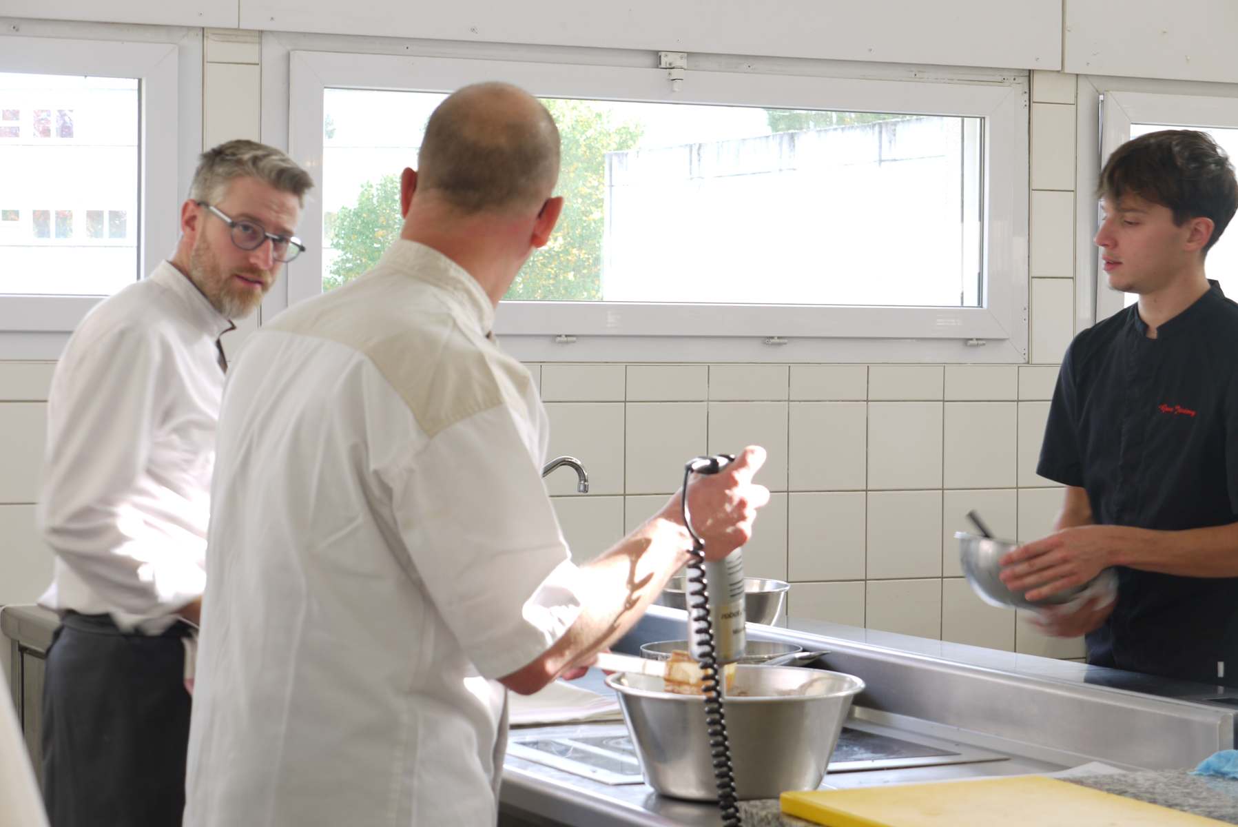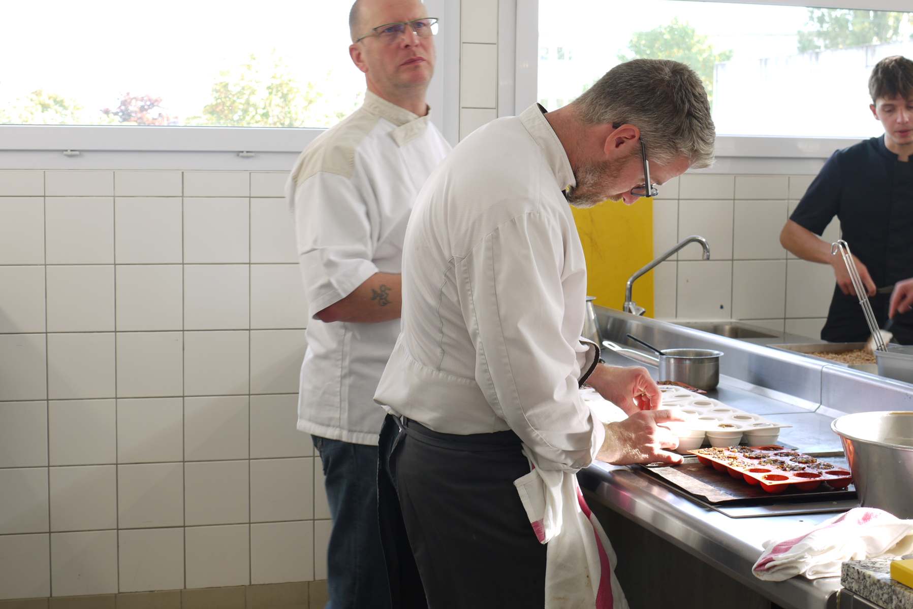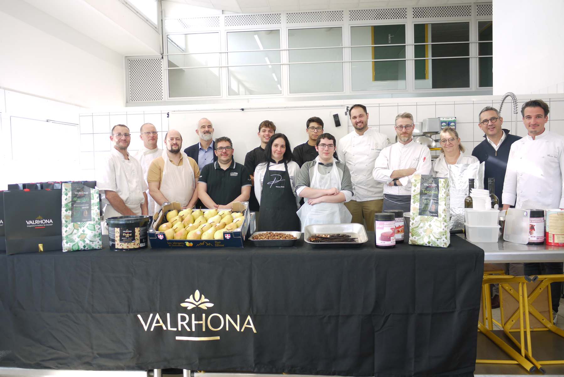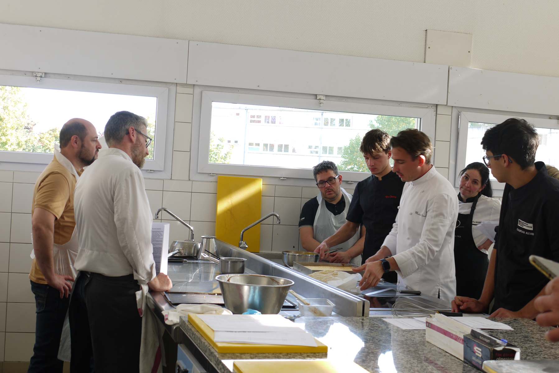 Ces journées de formations sont à l’initiative de Francois Helloco, commercial chez Valrhona. Après un temps d’accueil, la formation a pu débuter à 9 heures. Divisés en deux groupes, les 12 élèves se sont réparti les tâches entre eux pour réaliser la recette proposée après un premier brief. Le matin est au coeur des préparations tandis que l’après midi est consacrée aux finitions. À midi, le repas du lycée était proposé à l’ensemble des personnes présentes à la formation. Si en début de journée, les professionnels en formation restaient encore assez discrets et appréhensifs, au fil de la journée la tension de la formation se relâche avec cet esprit convivial.