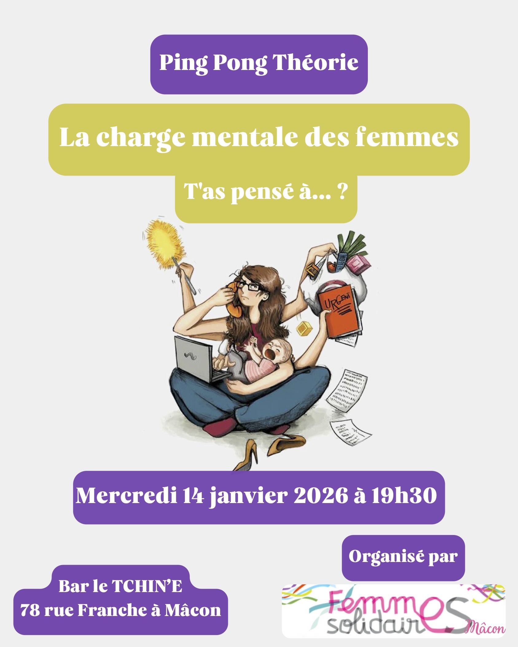 L’association Femmes Solidaires Mâcon organise sa 1ère soirée Ping Pong Théorie de l’année 2026 sur ce sujet : « Les femmes et la charge mentale : T’as pensé à…? », mercredi 14 janvier à 19h30, au Tchin’e à Mâcon.