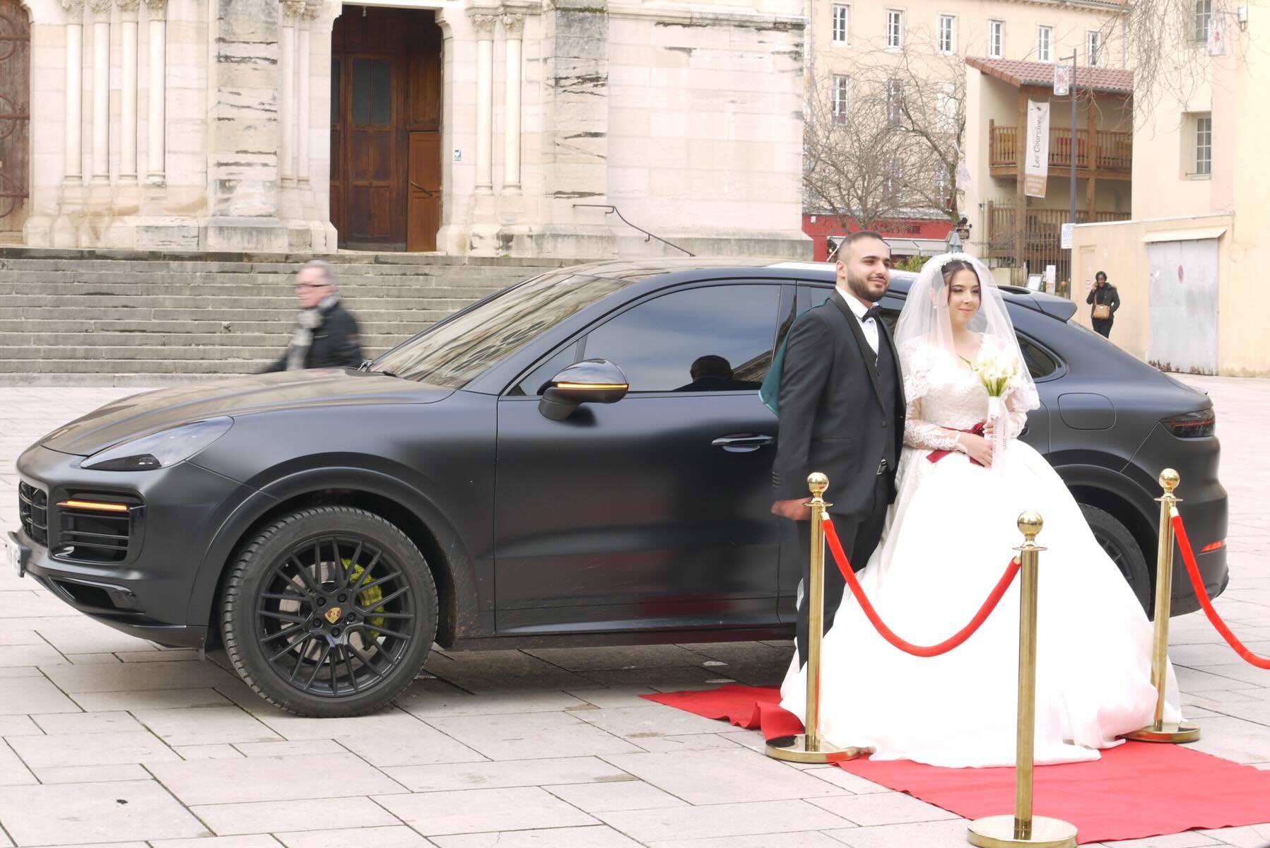 C'est dans une arrivée remarquable que le couple a fait son entrée, le futur marié déroulant le tapis rouge dès la sortie de la voiture, ouvrant la portière à sa bien-aimée.