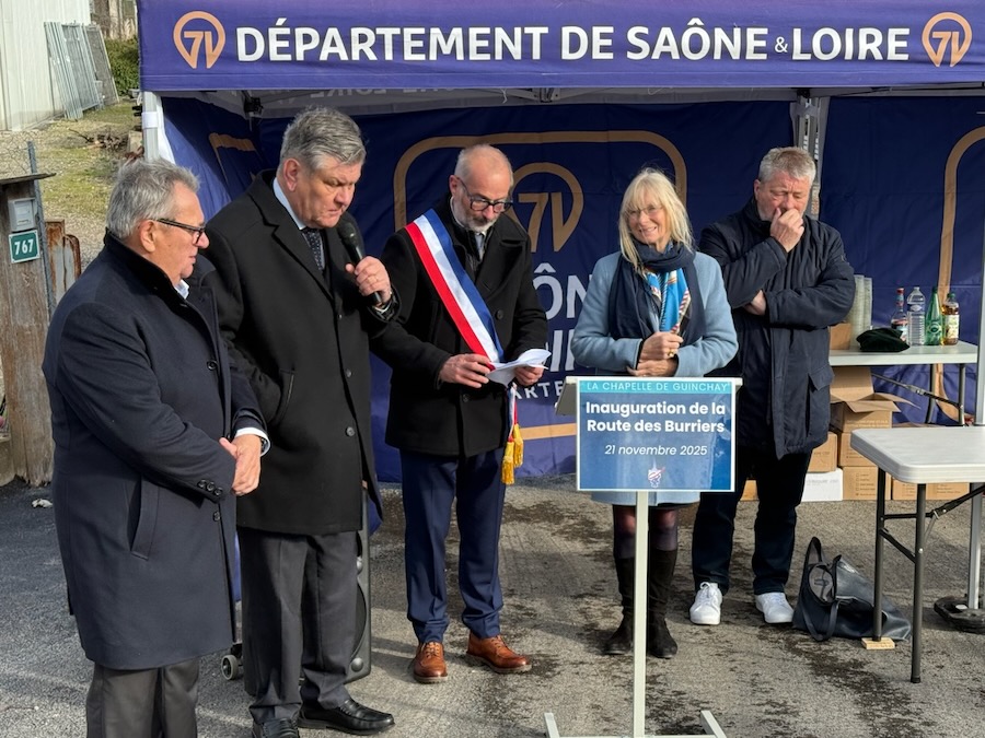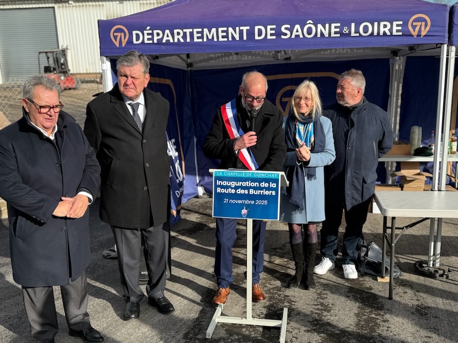 A ses côtés, Marie Mercier, sénatrice, Jean-François Cognard, représentant André Accary, président du Département, Jean-Patrick Courtois, maire de Macon et Président de MBA, ainsi que Patrick Buhot, maire adjoint de Charnay et vice-président de MBA.