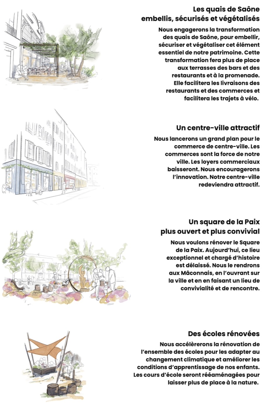 Un centre-ville attractif, où les commerces sont la force de notre ville. Des quais de Saône embellis et végétalisés, avec plus de place pour la promenade et les terrasses. Un centre Paul Bert réaménagé autour de « Mâcon plage », la porte sud de Mâcon embellie, avec la rénovation des Blanchettes et de Saint-Clément, un nouveau parc à Flacé, des écoles rénovées et, enfin, un square de la Paix plus ouvert et plus convivial.