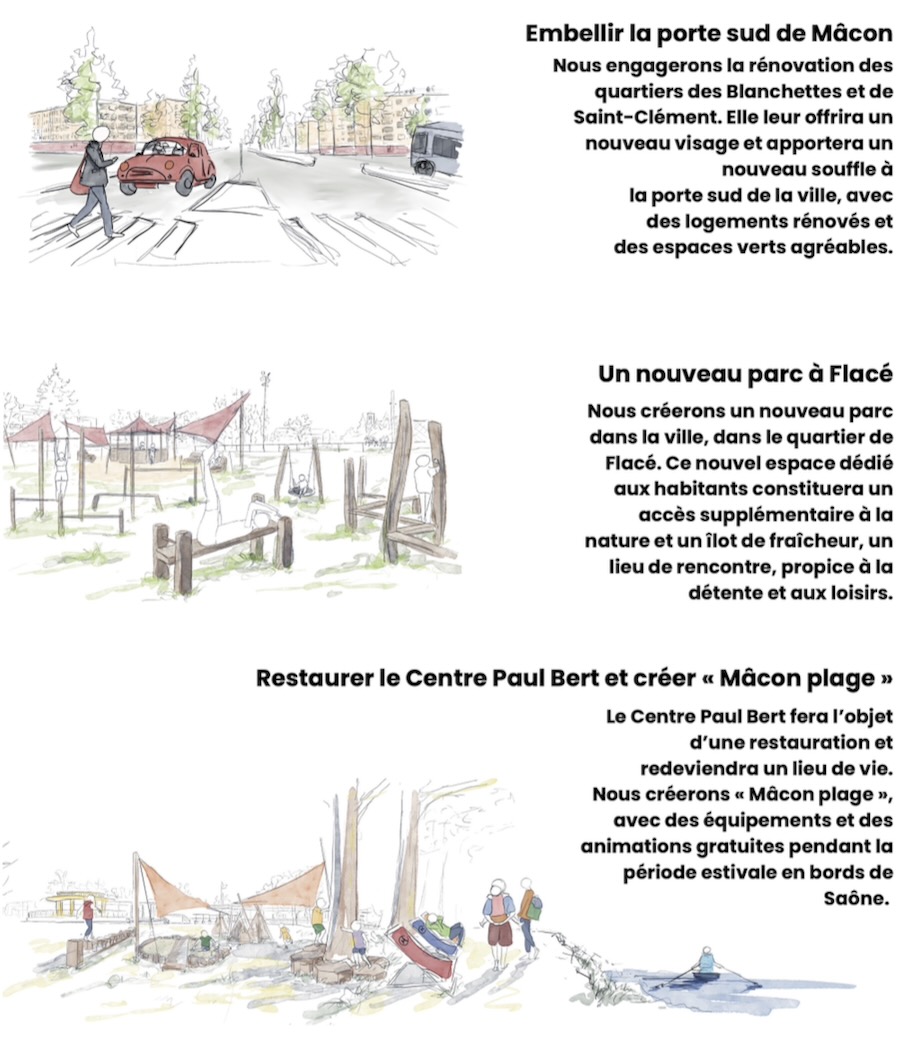 C’est ce que j’ai souhaité faire : imaginer ce que nous pouvons faire pour notre ville et vous le dire. Mais comment mieux vous dire les choses qu’en vous les montrant ? Un petit croquis en dit plus long qu'un grand discours, dit l’adage. J’ai voulu vous partager notre projet pour Mâcon avec des dessins de la ville telle que nous pourrions la faire demain.
