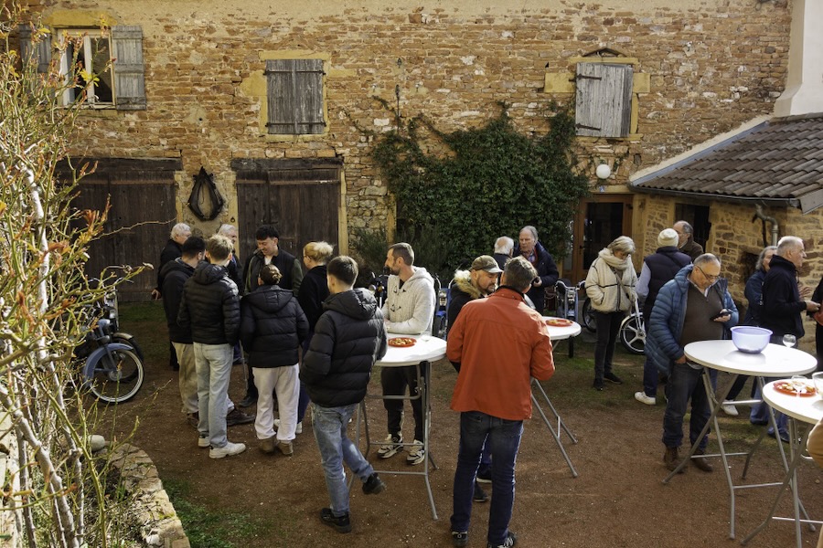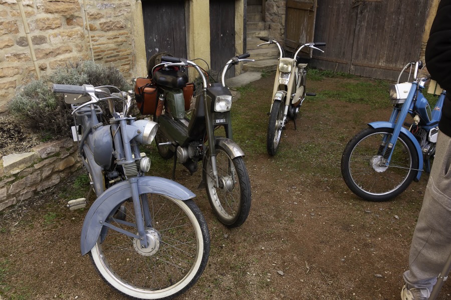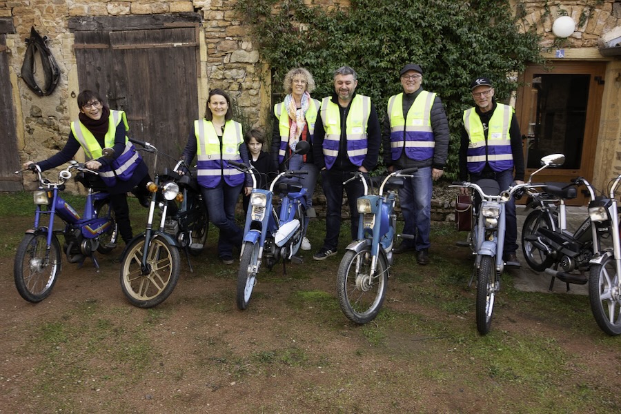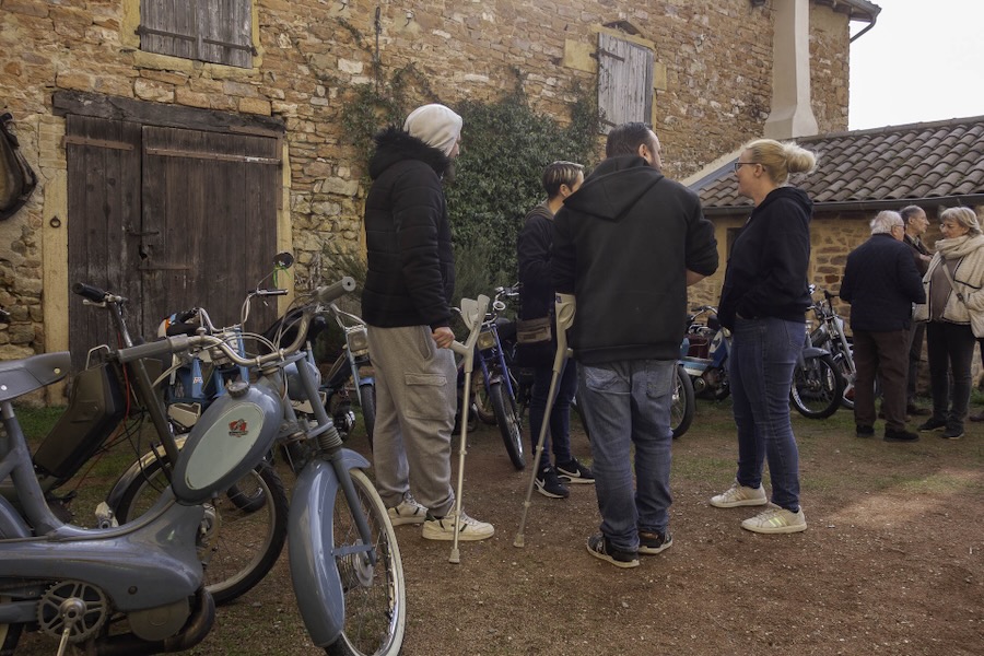 Dès 9h30 dimanche, c’était l’inauguration du club. L’équipe fondatrice recevait les personnes intéressées. Les cyclomoteurs alignés comme à la parade, dans la cour du caveau de Leynes indiquaient aux arrivants qu’ils étaient, sans nul doute, au bon endroit, et le brouhaha des conversations provenant de la cave leur indiquait sans erreur possible, le chemin à suivre.