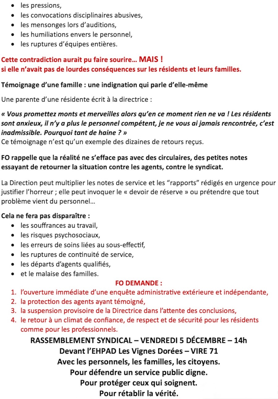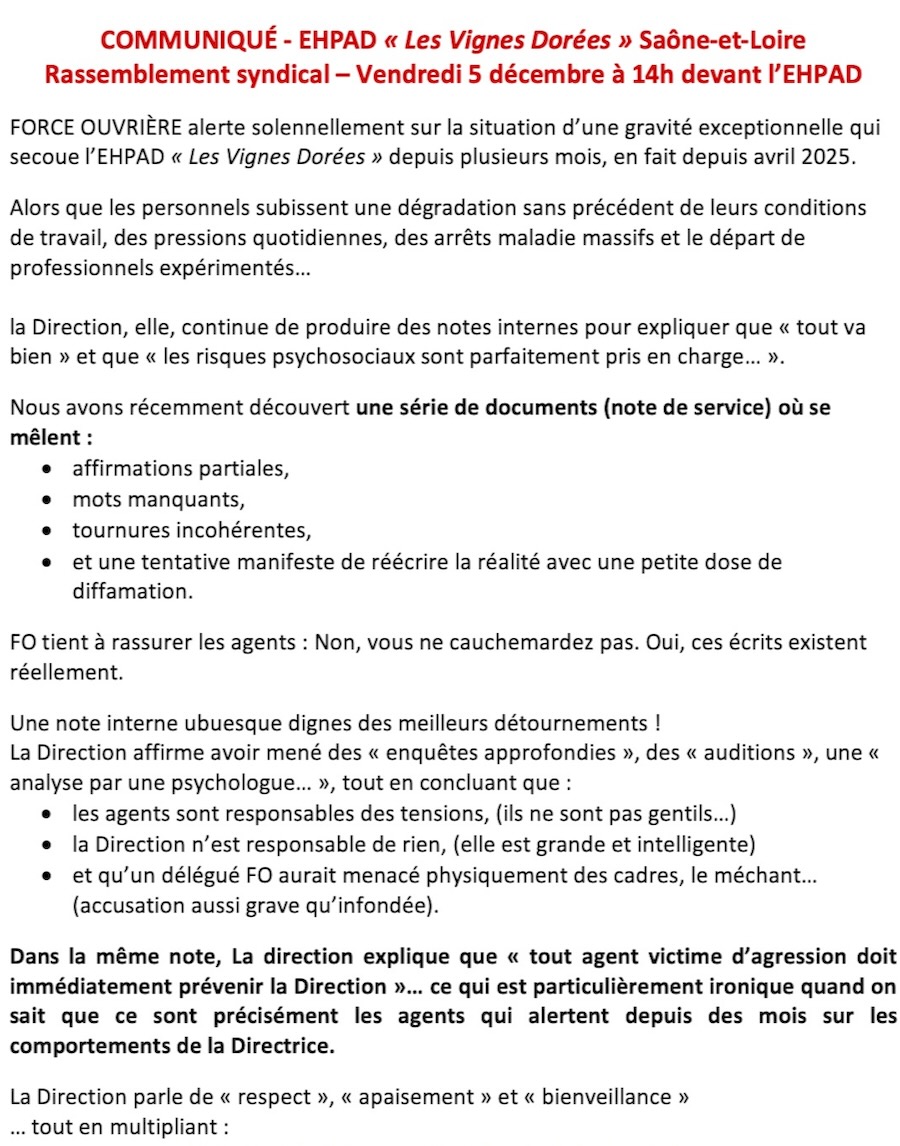 VIRÉ : FO alerte sur une grande souffrance au travail à l'EHPAD Les Vignes dorées