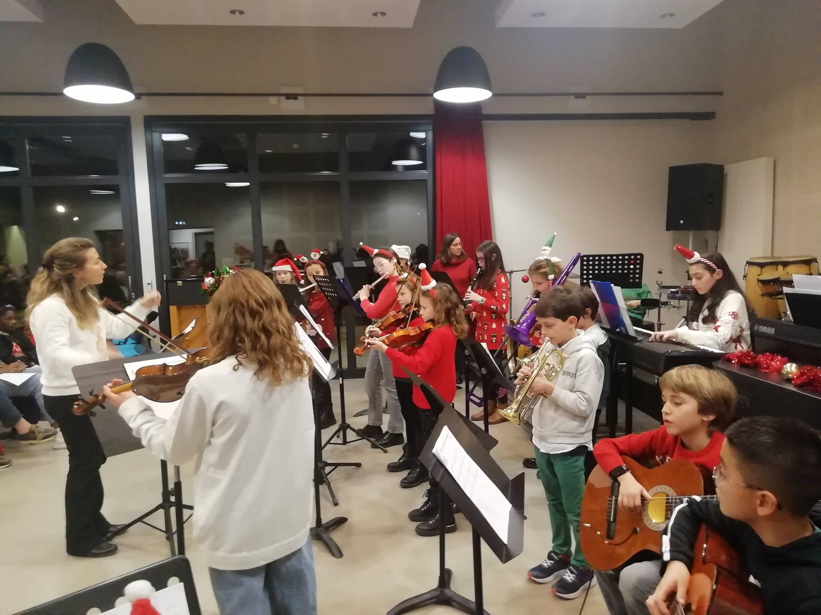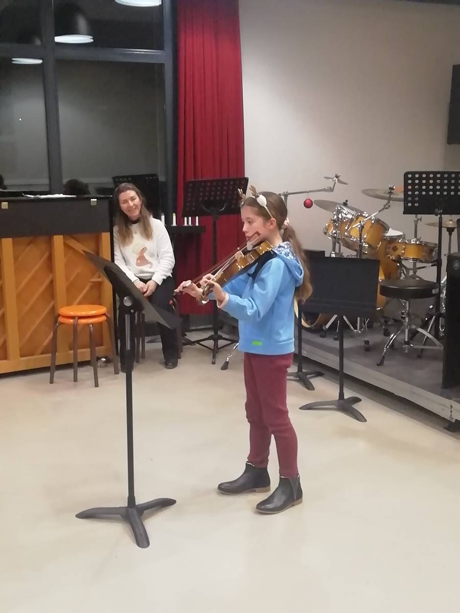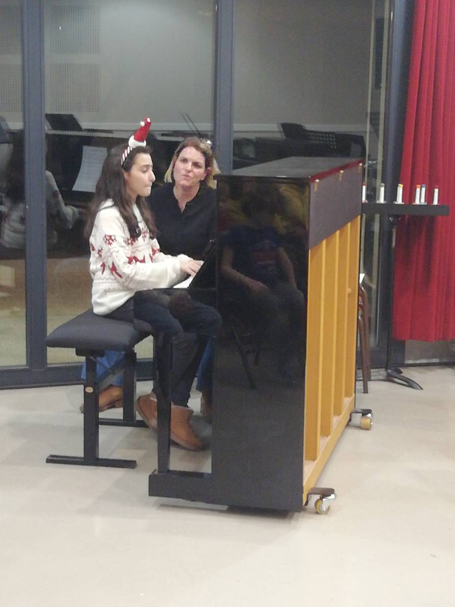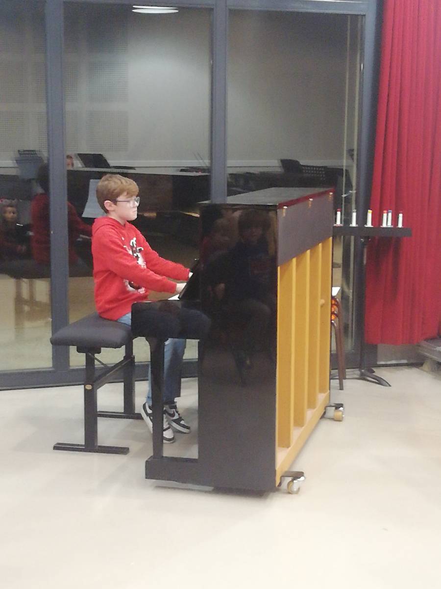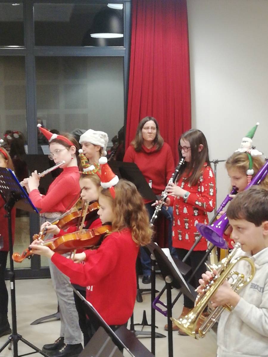 Alors le premier orchestre "La pépinière" se concentre et suit les gestes du professeur qui les guide. A chaque morceau, un enfant du groupe annonce le titre. Et c'est avec amusement que l'on remarque qu'ils sont tous vêtus d'un pull rouge, sur le thème de Noël, et que les filles portent un serre-tête avec des décorations originales: bonhomme de neige, bois de cerf, guirlande ou lutin malin. Parfois les instruments eux-même ont été décorés de la même manière mais plus discrète. Six enfants viendront ponctuer le rythme en se produisant au piano, mais aussi deux violonnistes accompagnées par leur professeur au piano. On a entendu des morceaux tels que "le Prélude de Bach", "Conte des fées" ou "Conte d'hiver", "Vive le vent", "We wish you a merry Christmas" "Petit papa Noël" ou "Mon beau sapin" et bien d'autres encore.