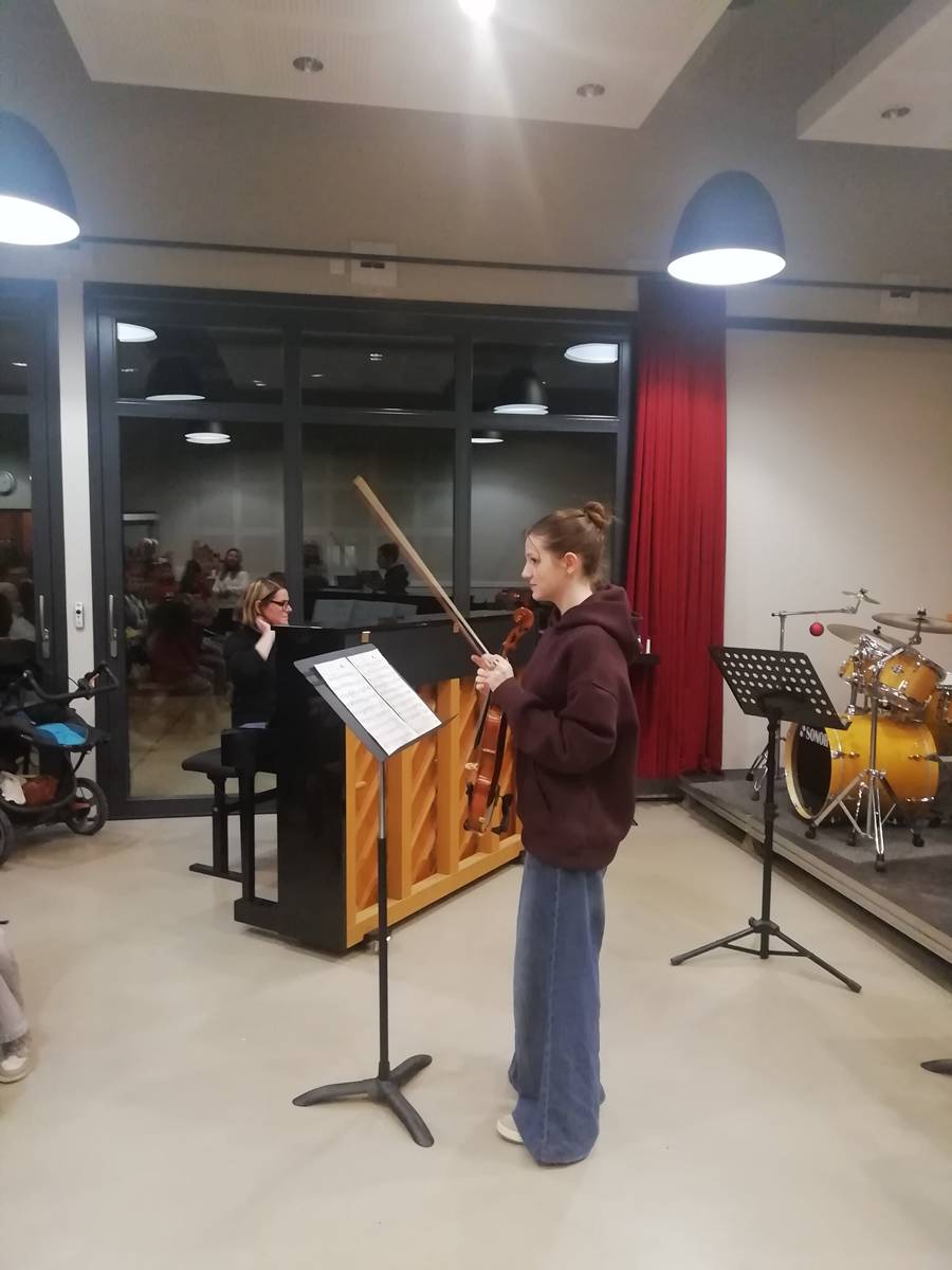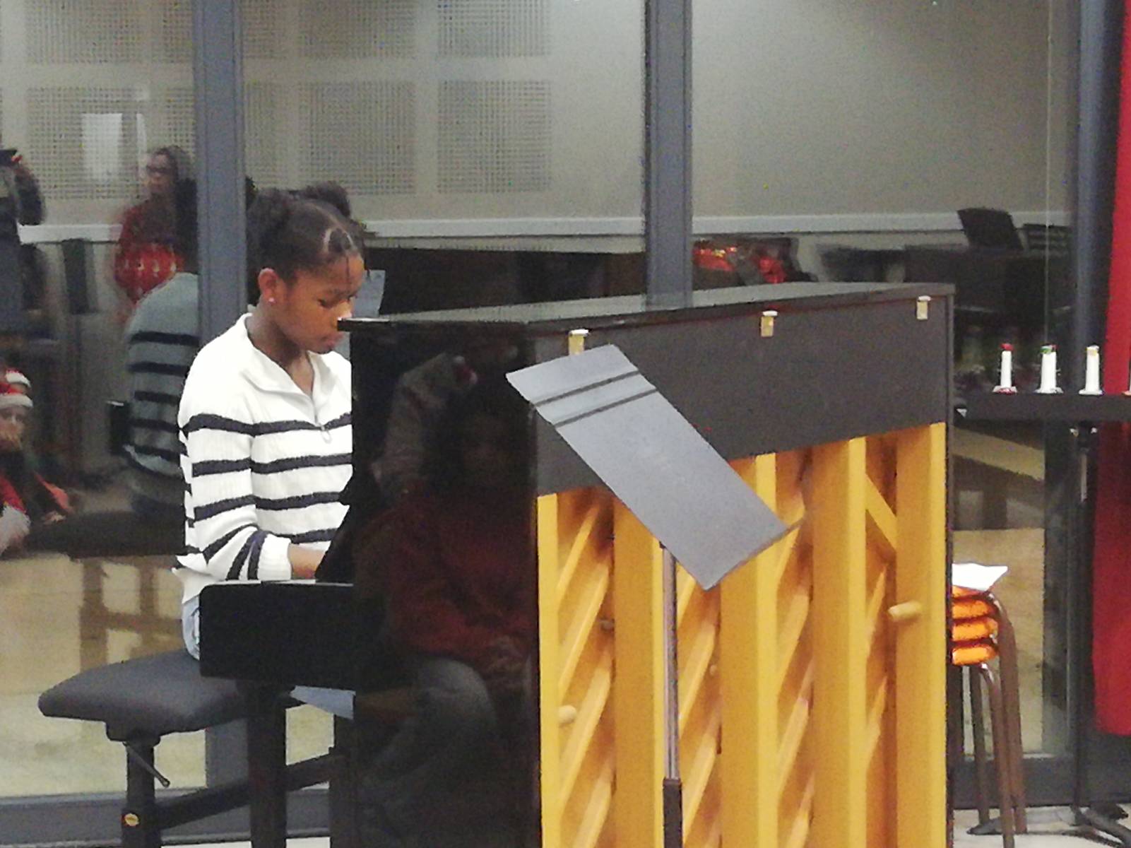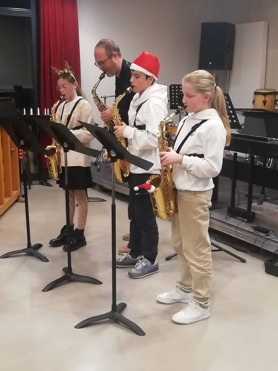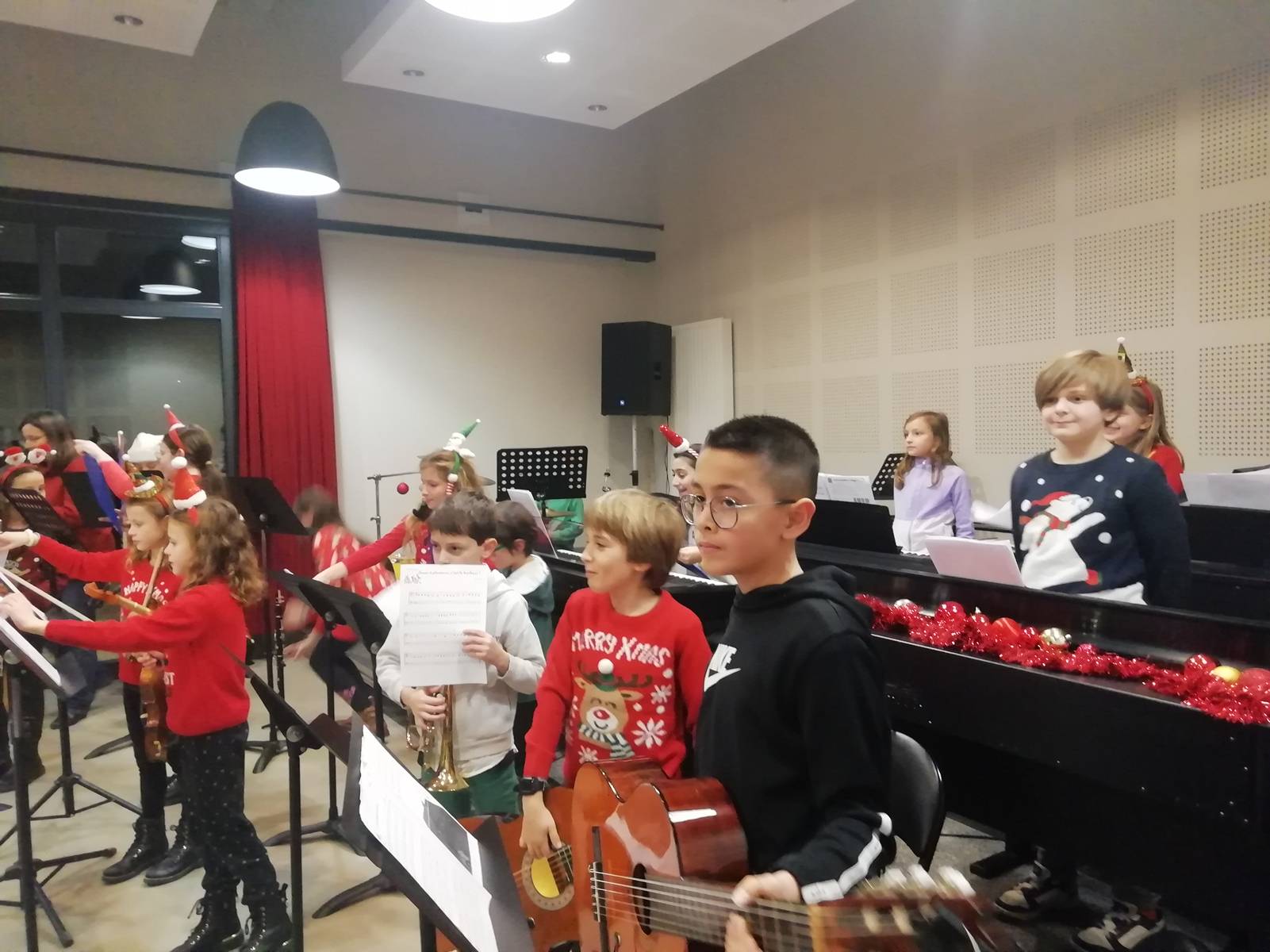 Alors le premier orchestre "La pépinière" se concentre et suit les gestes du professeur qui les guide. A chaque morceau, un enfant du groupe annonce le titre. Et c'est avec amusement que l'on remarque qu'ils sont tous vêtus d'un pull rouge, sur le thème de Noël, et que les filles portent un serre-tête avec des décorations originales: bonhomme de neige, bois de cerf, guirlande ou lutin malin. Parfois les instruments eux-même ont été décorés de la même manière mais plus discrète. Six enfants viendront ponctuer le rythme en se produisant au piano, mais aussi deux violonnistes accompagnées par leur professeur au piano. On a entendu des morceaux tels que "le Prélude de Bach", "Conte des fées" ou "Conte d'hiver", "Vive le vent", "We wish you a merry Christmas" "Petit papa Noël" ou "Mon beau sapin" et bien d'autres encore.