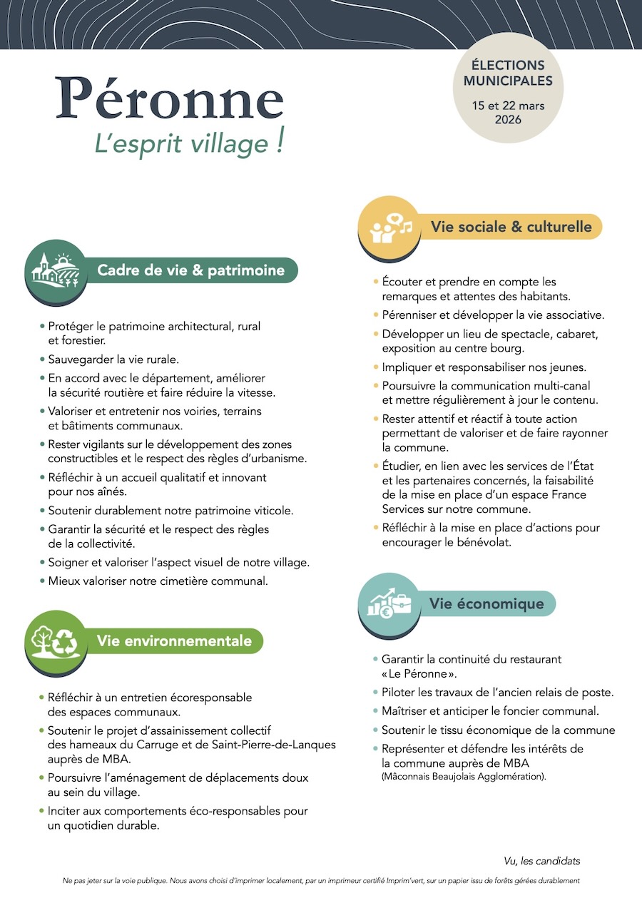 Nous aurons à cœur de renforcer le lien social et de préparer sereinement l’avenir du village. Ci-joint nos priorités, avec notamment la rénovation de l’ancien relais de poste en logements et en cabinets médicaux, mais aussi les déplacements doux, la sécurisation de la commune, le soutien aux associations, aux entrepreneurs et aux aînés...