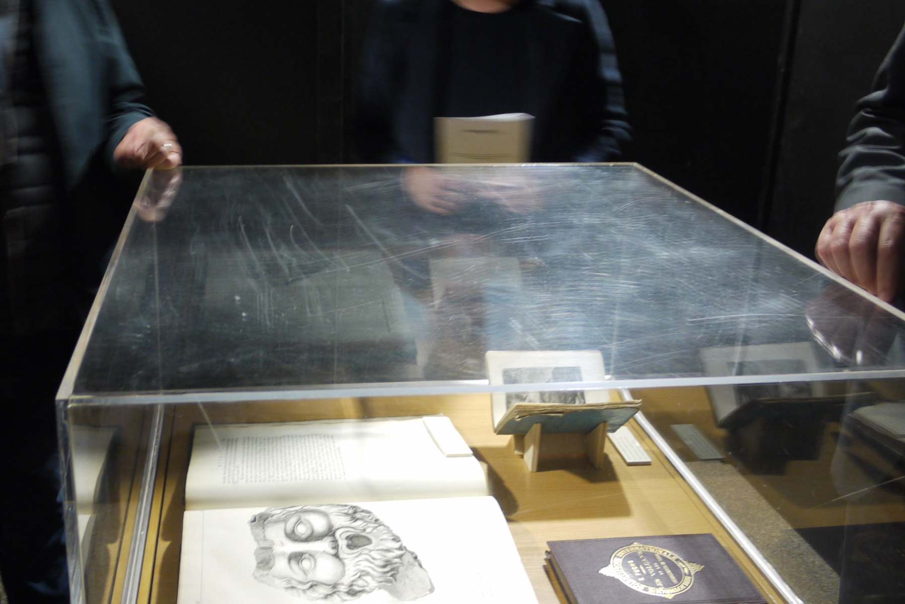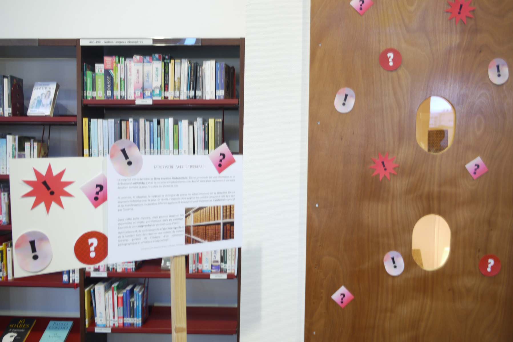 L’exposition est visible dès le hall de la médiathèque, mais est également dispersée dans les étages, dans un parcours traversant les différentes pièces. Dans le hall, deux émotions sont représentées sous des sphères, la tristesse, et l’esprit festif. Pour cette dernière, Amandine souligne que des archives de Lamartine ont été utilisées, ce qui est plutôt surprenant. À l’étage, sous forme de pièces ou box, trois autres émotions sont exposées : la peur, la colère et la surprise. On peut notamment citer dans la représentation de la peur une archive des écorchés, première représentation de l’anatomie humaine. Pour la dernière émotion, celle de la surprise, sont présentés des archives exclusives, très peu connues.