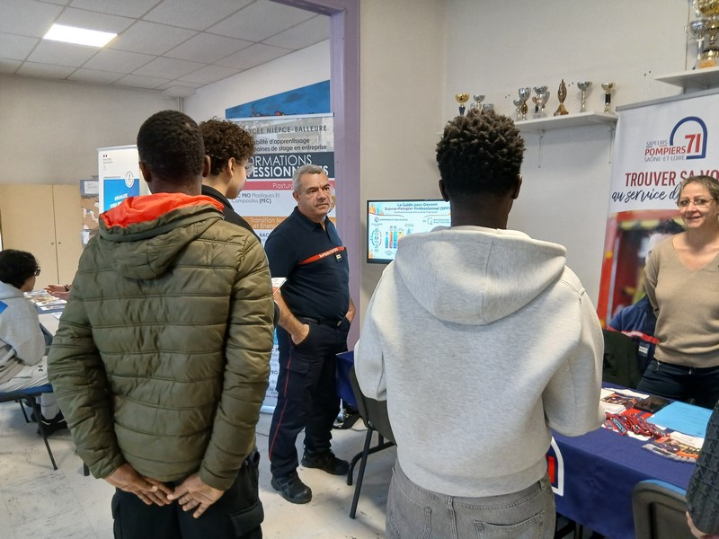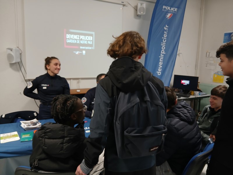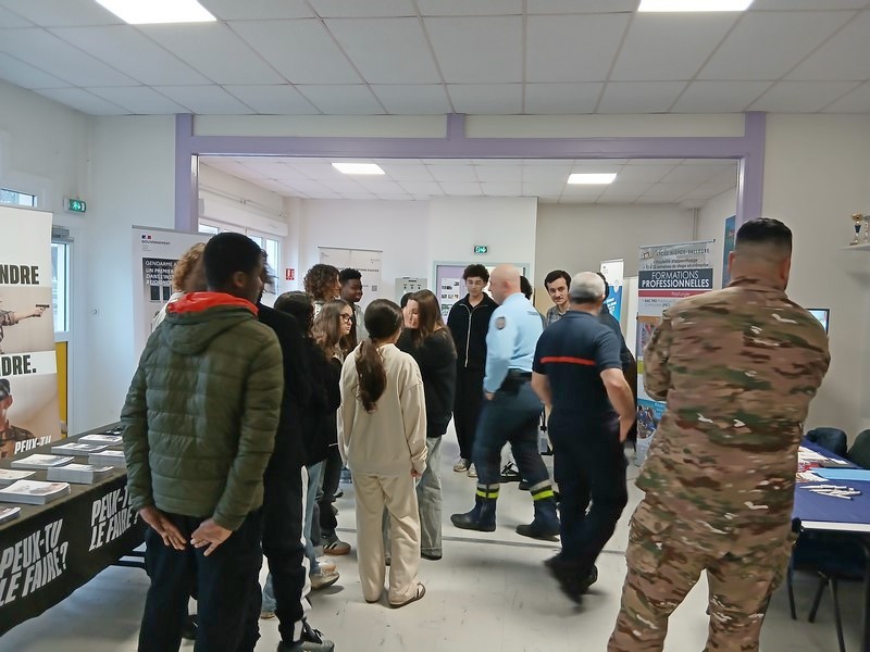 Ce matin, les jeunes de 3ème et 4ème du collège Schuman ont rencontré les professionnels des métiers de la sécurité au cours du Forum pensé et organisé par Christelle Voisin, responsable de la classe défense au collège. « C’est une première édition. J’ai souhaité que ces jeunes puissent rencontrer les différents métiers de la sécurité, au sens large puisque les métiers du droit et de la justice sont également présents ce matin. Cet événement se déroule dans le cadre de la semaine de l’orientation ». Une organisation pensée depuis septembre dernier, et qui semble être une belle réussite puisque 6 classes de 3ème se sont relayées toute la matinée, parmi elles, quelques élèves de l’enseignement adapté. Quant aux 4eme seuls les volontaires sont venus. Les jeunes disposaient d’une trentaine de minutes pour faire le tour des stands. Les professionnels qui ont répondu présents : Gendarmerie, Police nationale, Armée de terre (CIRFA), Pompiers, Pénitentiaire, Avocat, et la Marine, venue spécialement de Chalon sur Saône.
