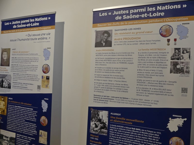 Les 4 premiers panneaux précisent le contexte : la position géographique des Justes de Saône-et-Loire, la situation générale des juifs en Europe, en France et en Saône-et-Loire, la création du mémorial Yad Vashem à Jérusalem décernant le titre de Juste et l'entrée des « Justes » au panthéon en 2007.