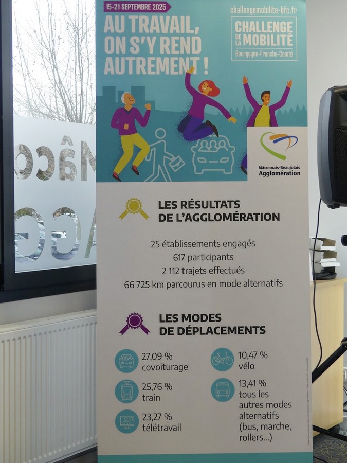 Ce mardi 25 novembre à la mi-journée, le Président de Mâconnais-Beaujolais Agglomération et sa Vice-présidente en charge des mobilités durables ont remis les prix de la 5ème édition du challenge de la mobilité au siège de l'Agglomération.