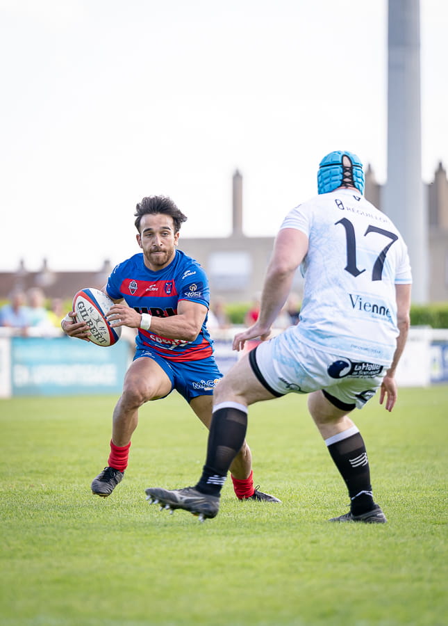 Et ce fut difficile aujourd’hui pour les Rouge & Bleu, surpris d’entrée de jeu par les visiteurs qui annoncent la couleur avec cet essai transformé dès la 2ème minute, 0-7. Cela ne va pas s’arranger ensuite avec les viennois qui creusent l’écart grâce à un essai de Bourquin, une nouvelle fois transformé par Dorrival, 0-14 (22’). Ce même Dorrival inscrit une pénalité (36’) pour porter le score à 0-17. Heureusement, les mâconnais s’en sortent bien en bénéficiant d’un essai de pénalité juste avant le coup de sifflet de la mi-temps, score à la pause 7-17.