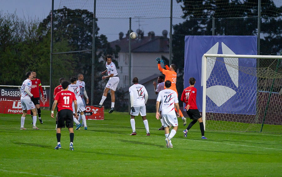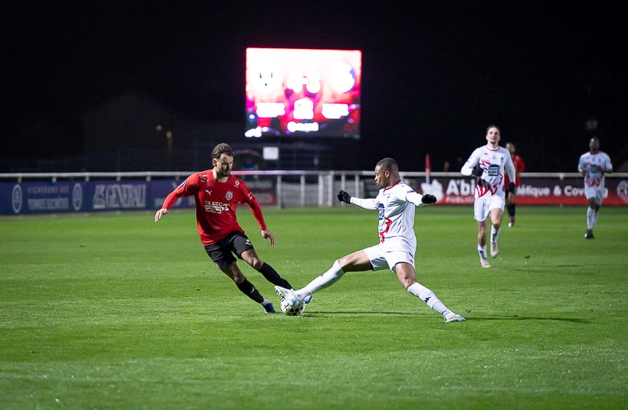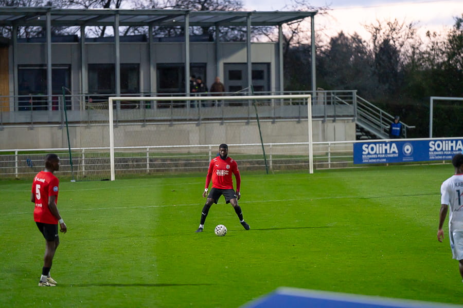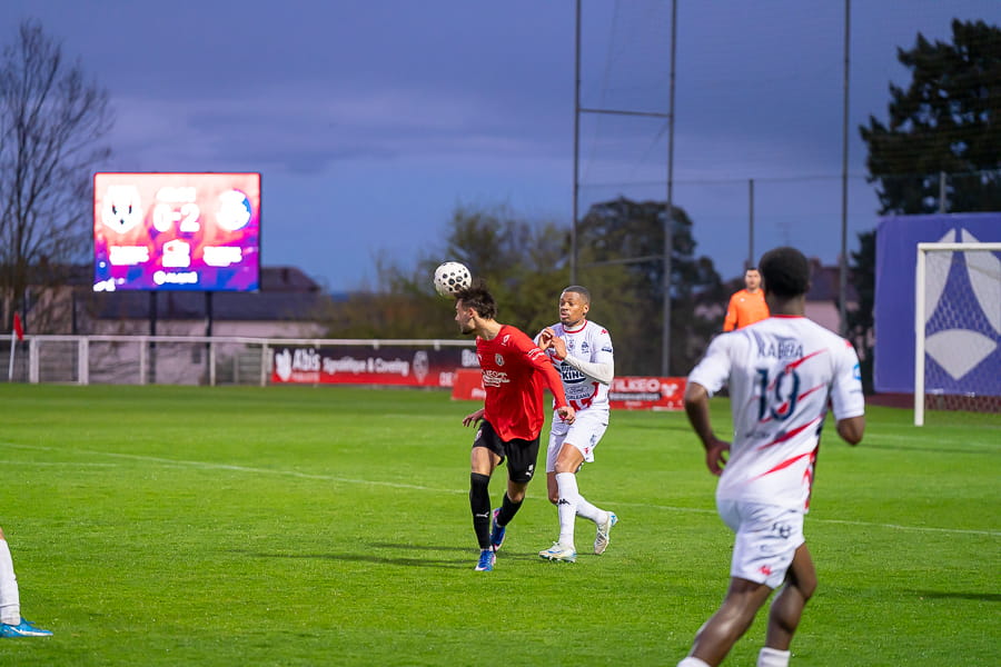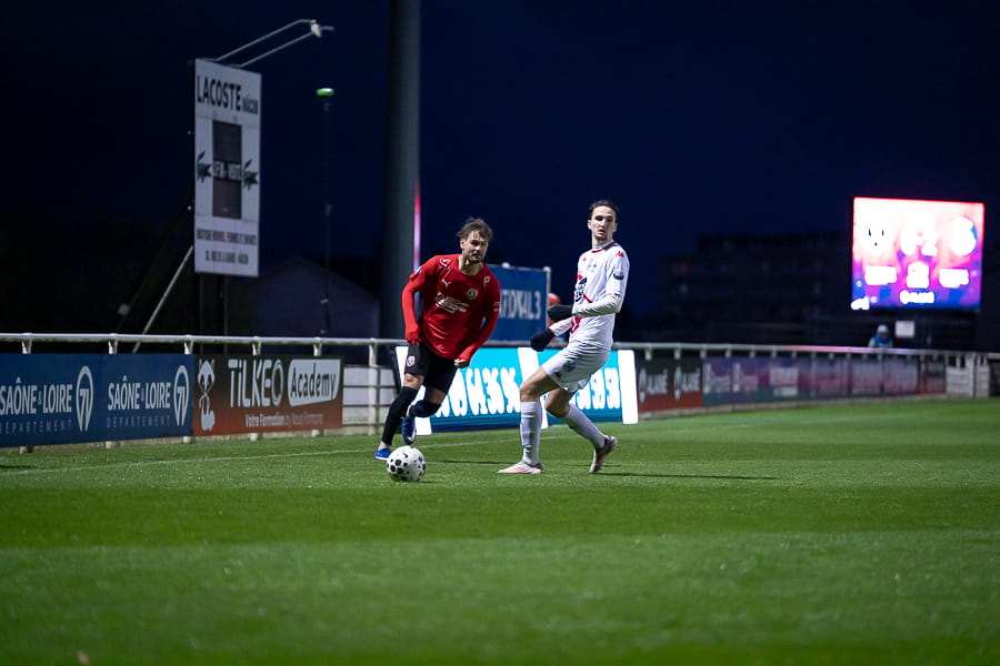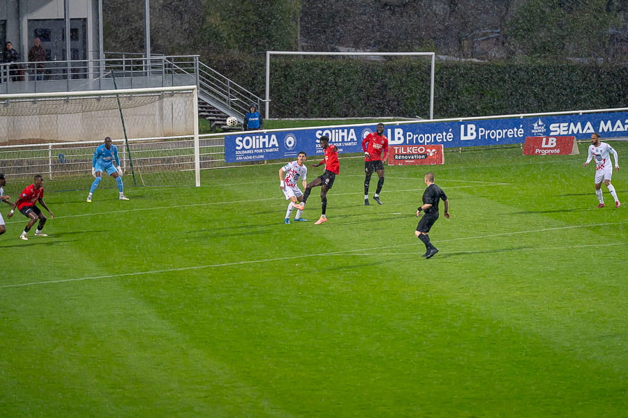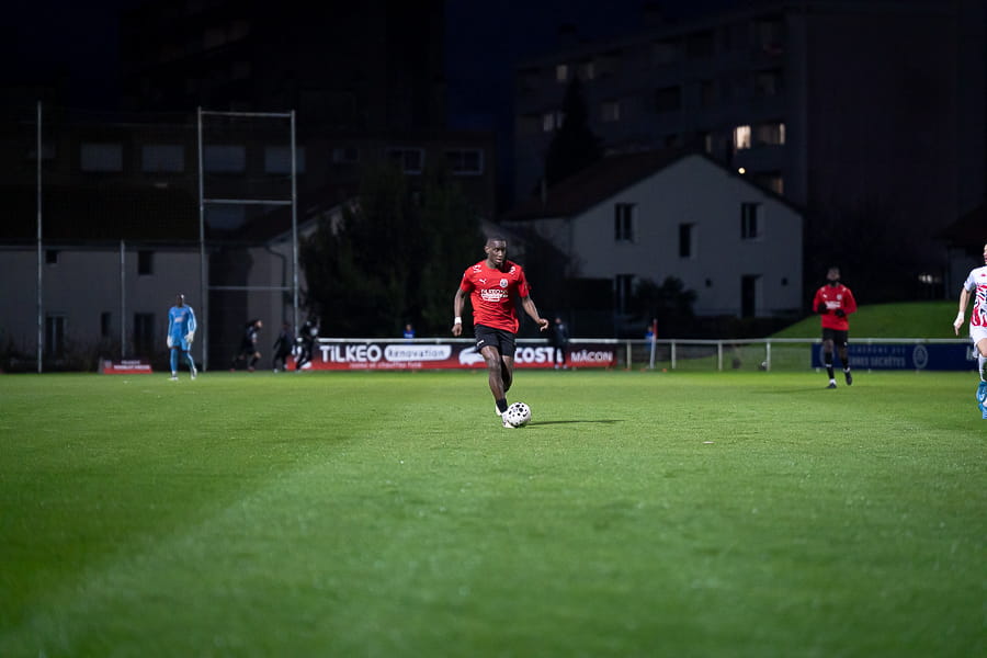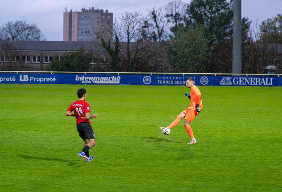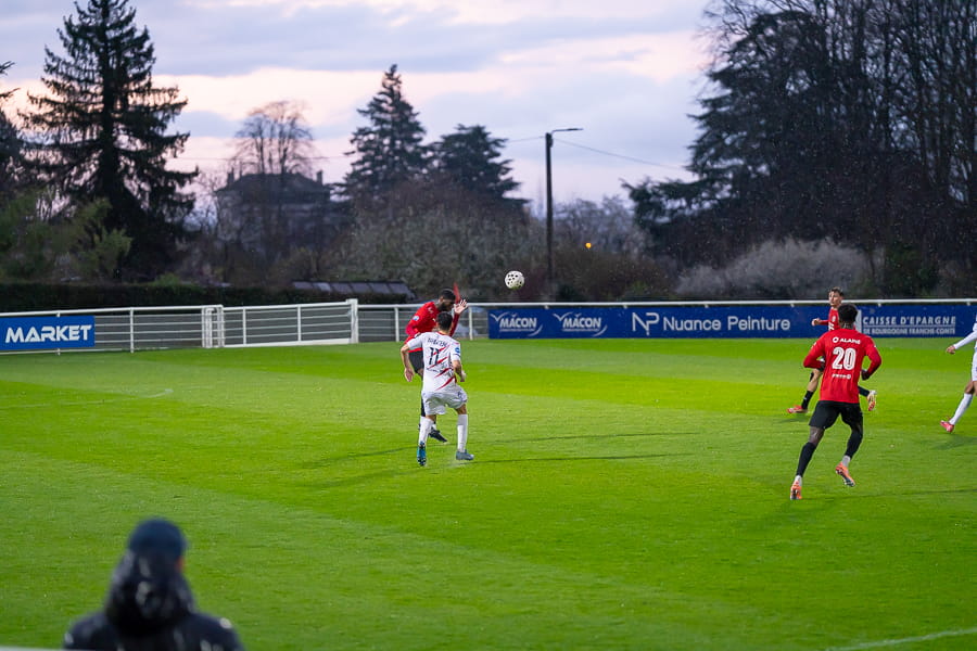 Avec les giboulées de mars qui se sont invités sur la pelouse du stade Pierre Guerin, les joueurs du coach Fred Jay se font surprendre dès la 13ème minute par le numéro 9 adverse Yanis Ammour, 0-1. Les préfectoraux ont le ballon et tentent de réagir par l’intermédiaire de leur capitaine Farras qui coupe au premier poteau et place une tête puissante qui vient mourir sur la barre transversale (19’). Les joueurs du Mâcon 71 font le jeu mais les visiteurs, qui luttent pour le maintien, placent des attaques rapides et efficaces. Ils bénéficient aussi d’erreurs inhabituelles de la part de la défense mâconnaise comme à la 40ème minute avec cette glissade du gardien Yirango qui profite à l’avant centre Ammour qui n'a plus qu'à pousser le ballon dans les buts vides pour le doublé. Mâcon 71 est donc mené 0-2 à la mi-temps.