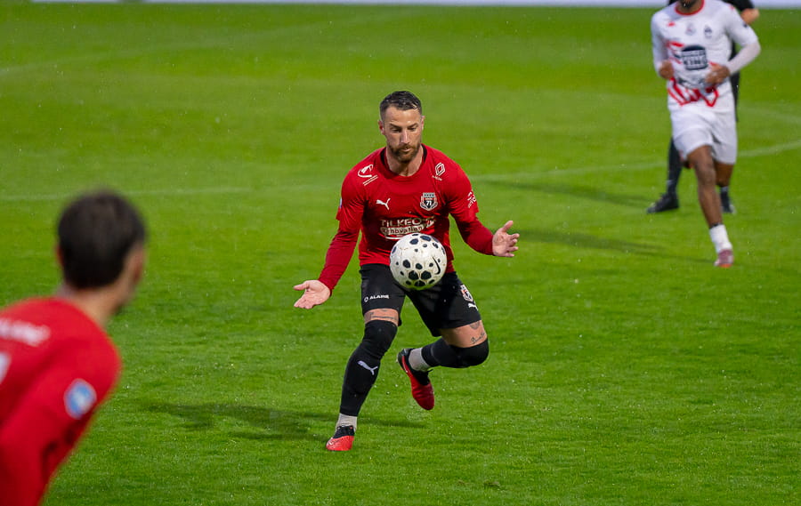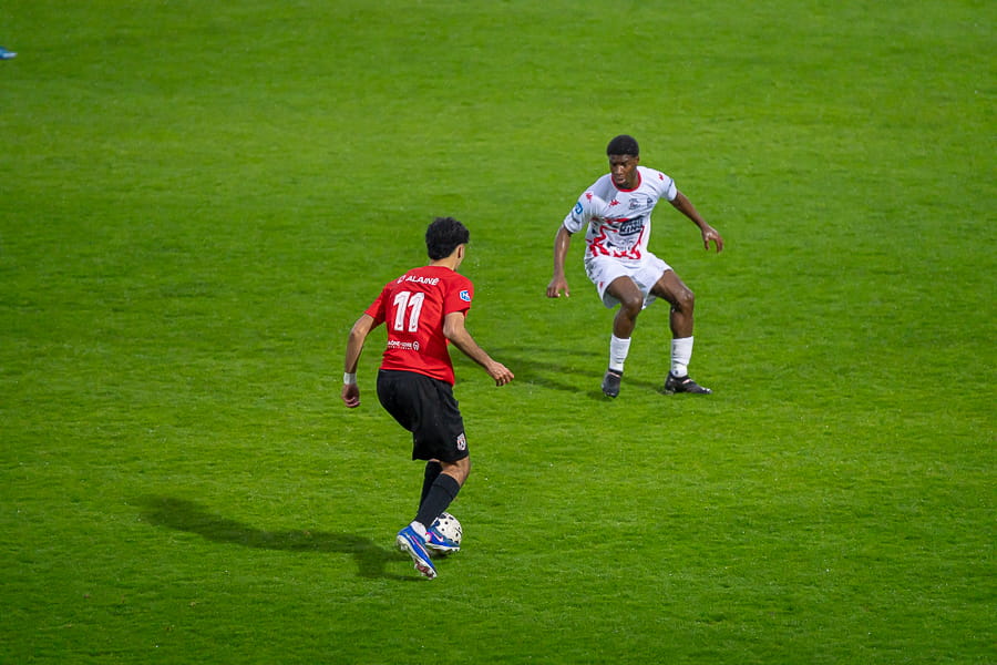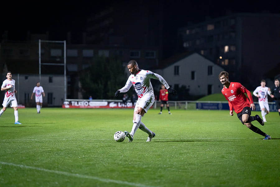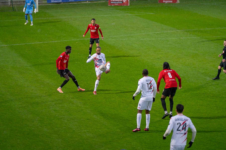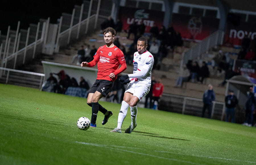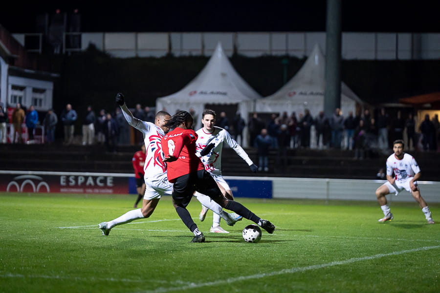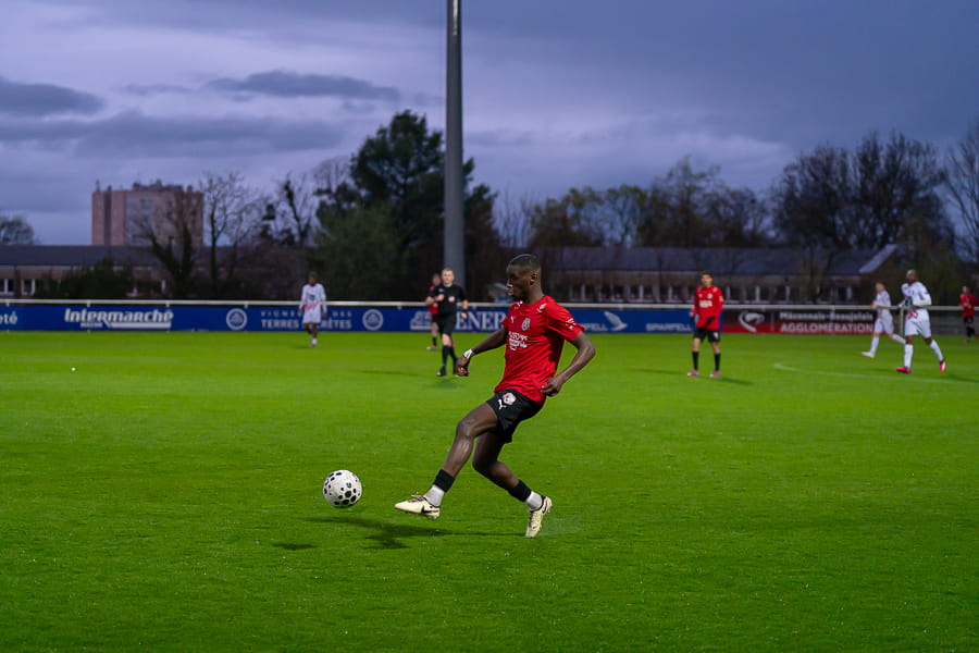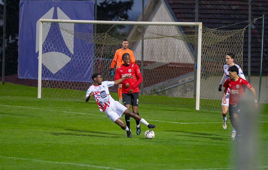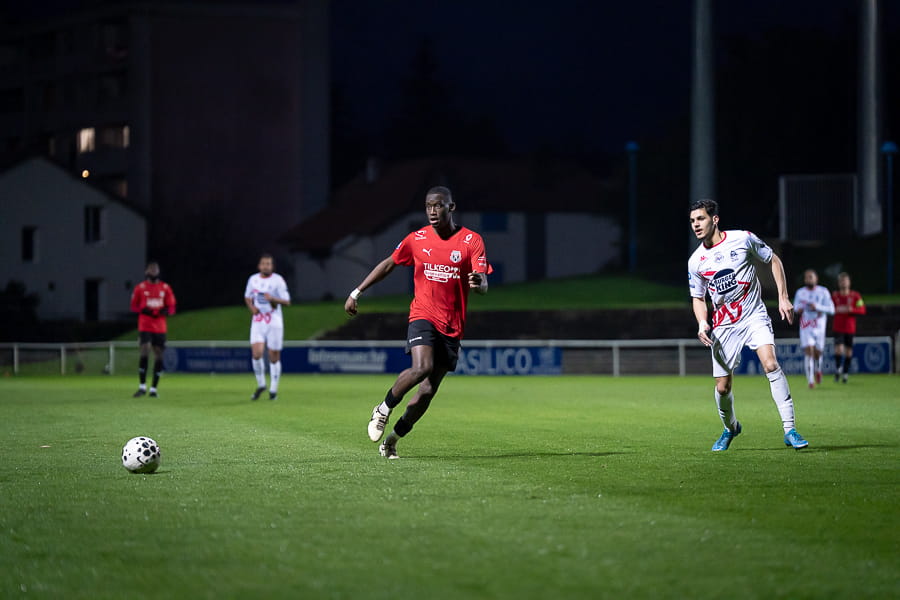 Avec les giboulées de mars qui se sont invités sur la pelouse du stade Pierre Guerin, les joueurs du coach Fred Jay se font surprendre dès la 13ème minute par le numéro 9 adverse Yanis Ammour, 0-1. Les préfectoraux ont le ballon et tentent de réagir par l’intermédiaire de leur capitaine Farras qui coupe au premier poteau et place une tête puissante qui vient mourir sur la barre transversale (19’). Les joueurs du Mâcon 71 font le jeu mais les visiteurs, qui luttent pour le maintien, placent des attaques rapides et efficaces. Ils bénéficient aussi d’erreurs inhabituelles de la part de la défense mâconnaise comme à la 40ème minute avec cette glissade du gardien Yirango qui profite à l’avant centre Ammour qui n'a plus qu'à pousser le ballon dans les buts vides pour le doublé. Mâcon 71 est donc mené 0-2 à la mi-temps.