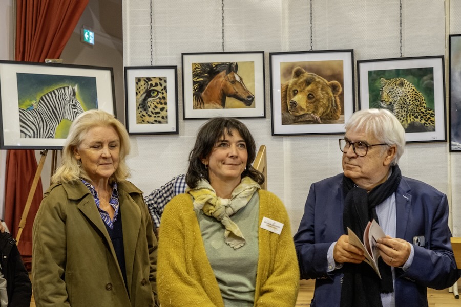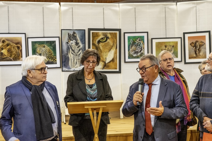 En présence d’Hervé Reynaud, Conseiller départemental délégué à la Cuture et au Patrimoine, de Jean-François Cognard, Maire de Chaintré et Conseiller départemental, ainsi que des Maires et représentants des communes voisines, Jacqueline Bourdon a tout d’abord remercié les personnalités présentes. Elle a ensuite présenté l’invitée d’honneur, Éliane Brun, artiste autodidacte qui a découvert, un peu par hasard, la technique du pastel il y a 25 ans. Passionnée par le monde animal, elle a effectué plusieurs voyages en Afrique, où elle s’est imprégnée d’ambiances inoubliables de la vie sauvage, qu’elle a su retranscrire avec talent sur ses toiles.