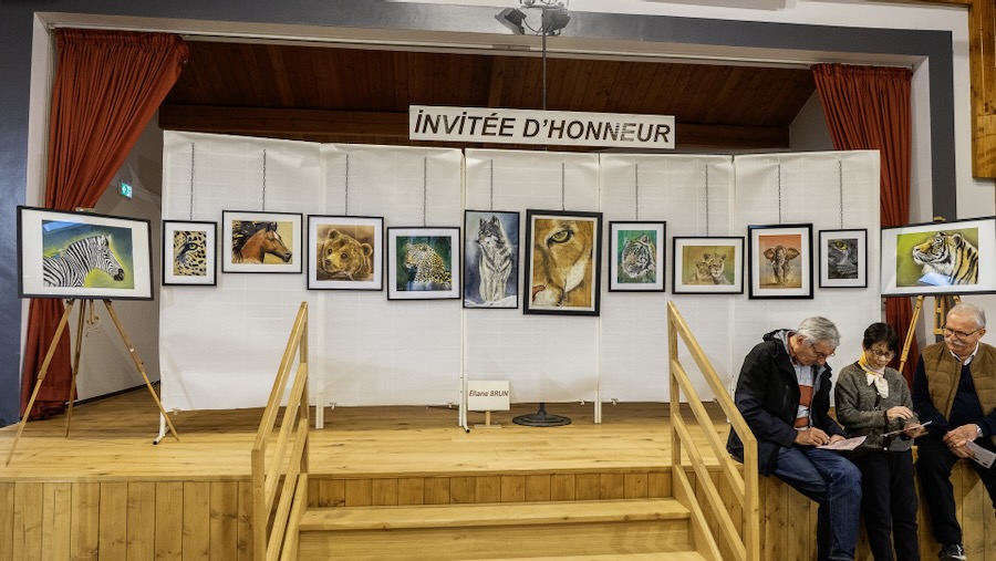 En vedette sur la scène, l’invitée d’honneur, Éliane Brun (Prix Roger Dubœuf de l’édition 2024) expose ses pastels secs. Et dans la salle, on retrouve Gérard Briday, vainqueur du prix Cantriaca 2024.