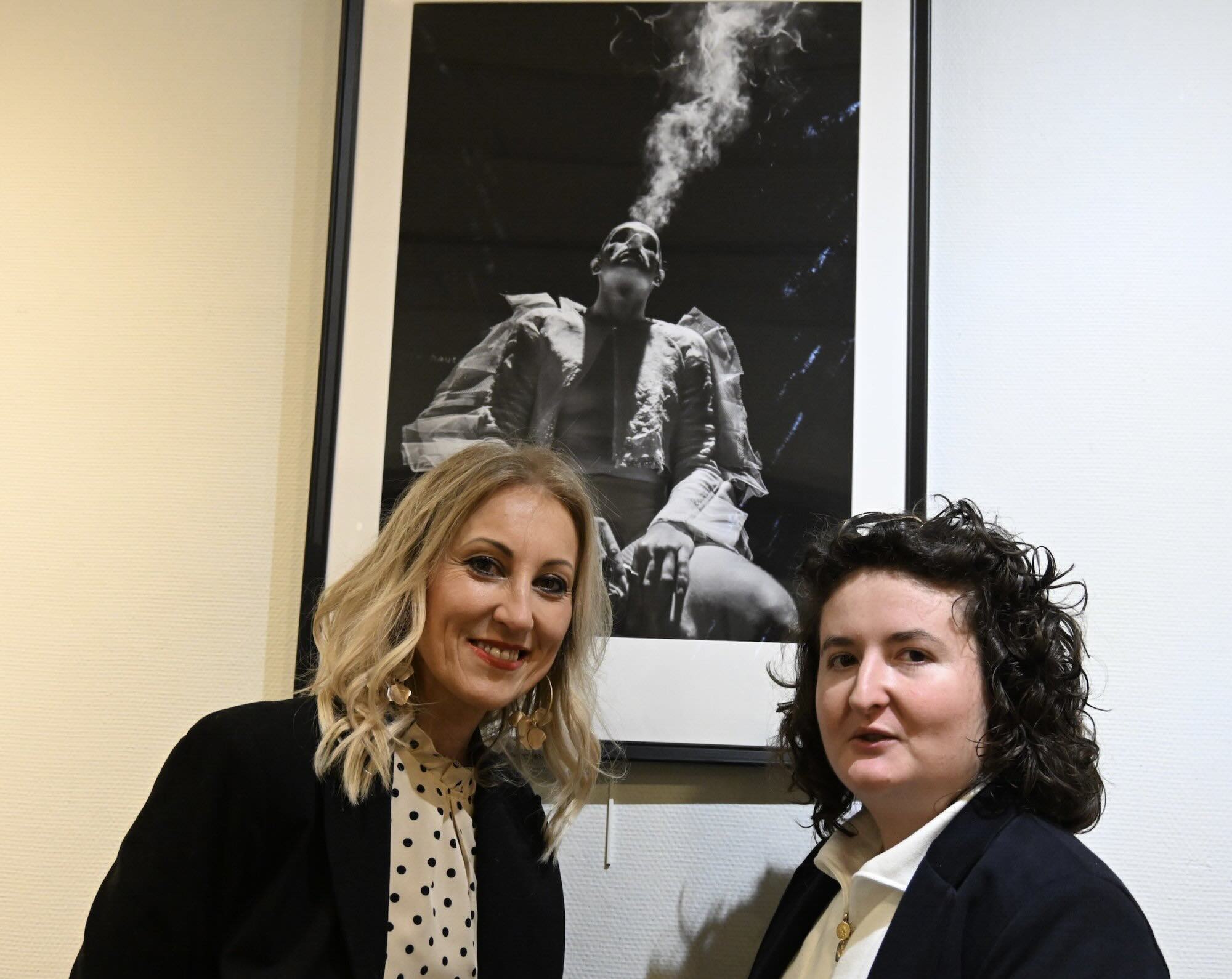Manon Bollery (à droite) pose devant l'un de ses clichés. Cette exposition réunit trois univers photographiques qui se répondent et s’enrichissent mutuellement : la scène, la gastronomie et le portrait artistique. Chaque image cherche à capturer l’intensité d’un instant et la richesse des émotions qu’il porte.