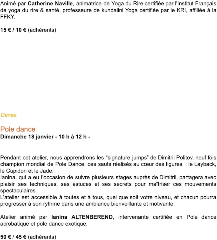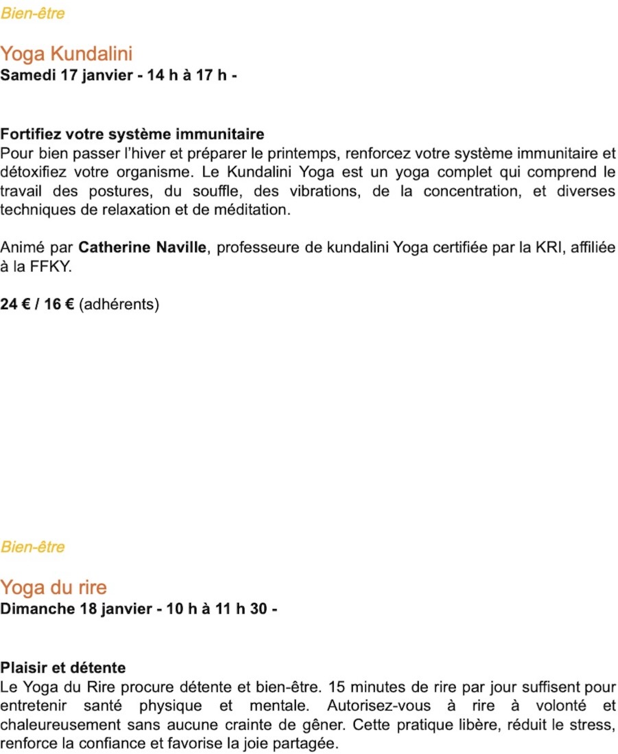 Conférences ; yoga de l'énergie ; auto-coaching ; Parent & Bambin, à vous de jouer ; fabriquer une couronne de Noël etc. Découvrez vite le programme de décembre ici-même. 1er rendez-vous dès mardi