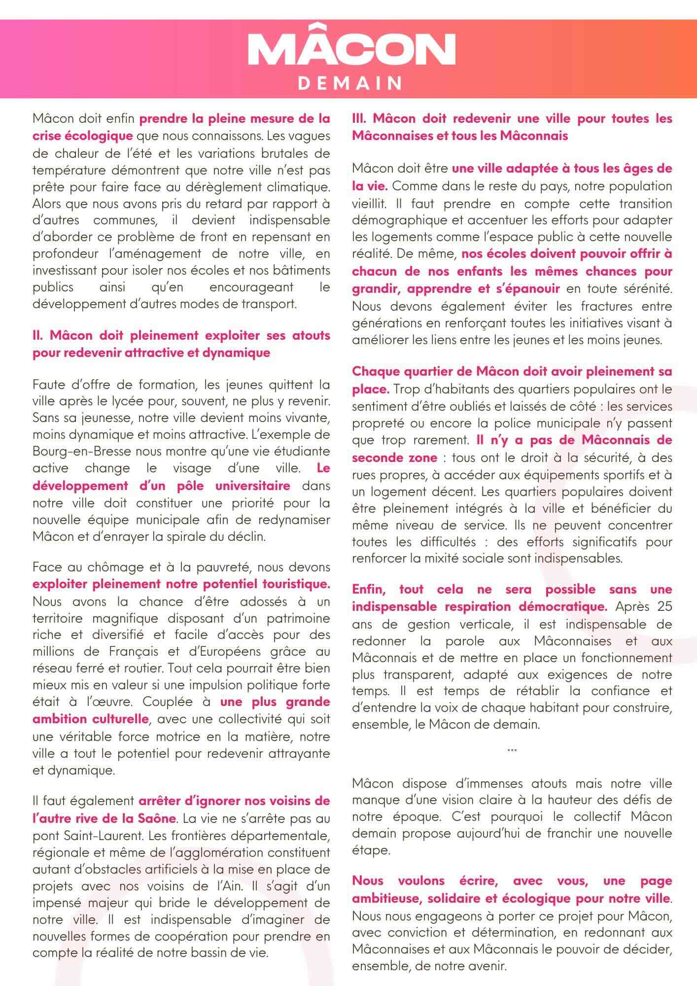 Au cours de sa déclaration à la presse, il n’a pas donné dans l’attaque frontale contre le maire de Mâcon et a fait part de sa volonté « d’écrire une nouvelle page ». Ceci dit, il ne tourne pas autour du pot et dresse les urgences à traiter pour « une ville que ses habitants ne reconnaissent plus » affirme-t’il. « Mais il n’y a pas de fatalité. Nous avons défini 5 urgence pour écrire cette nouvelle page : d’abord s’attaquer à l'insécurité, « Il nous faut prendre ce sujet à bras le corps et arrêter avec les pudeurs de gazelles. Ensuite, traiter la crise du commerce de centre-ville. En trois, le logement, avec un sujet, celui du parc privé. Quatre, la santé. Mâcon est un désert médical ! Enfin, s’attaquer sérieusement à la crise écologique. » Après cette énumération des priorités, le désormais candidat a évoqué trois impensés de la majorité actuelle : la vie universitaire, le potentiel touristique de la ville et la frontière administrative qui bride le développement.