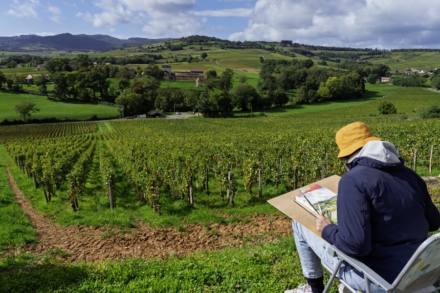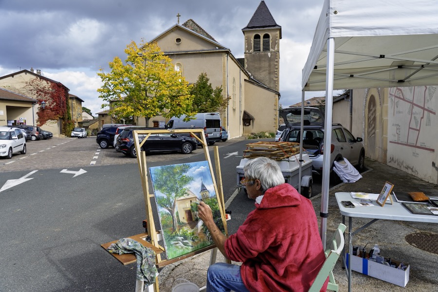 La météo du matin n’était pas engageante, mais finalement la journée s’est déroulée sous un ciel clément. Les 13 peintres, invités par Cantriaca, ont pu installer leurs chevalets dans les ruelles et chemins de Chaintré, comme le veut le concept de Peintres dans la Rue.