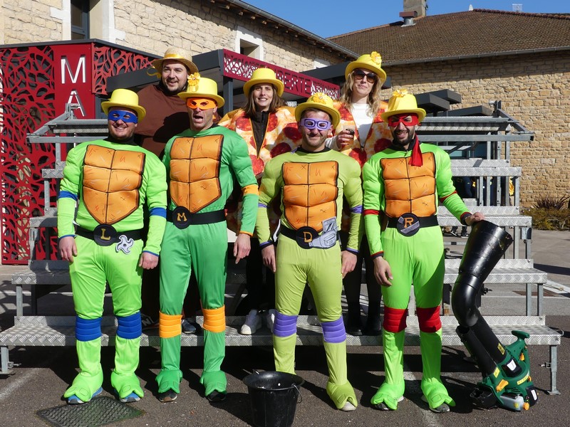 7 trentenaires costumés en Tortue Ninja prenaient place sur leur char.