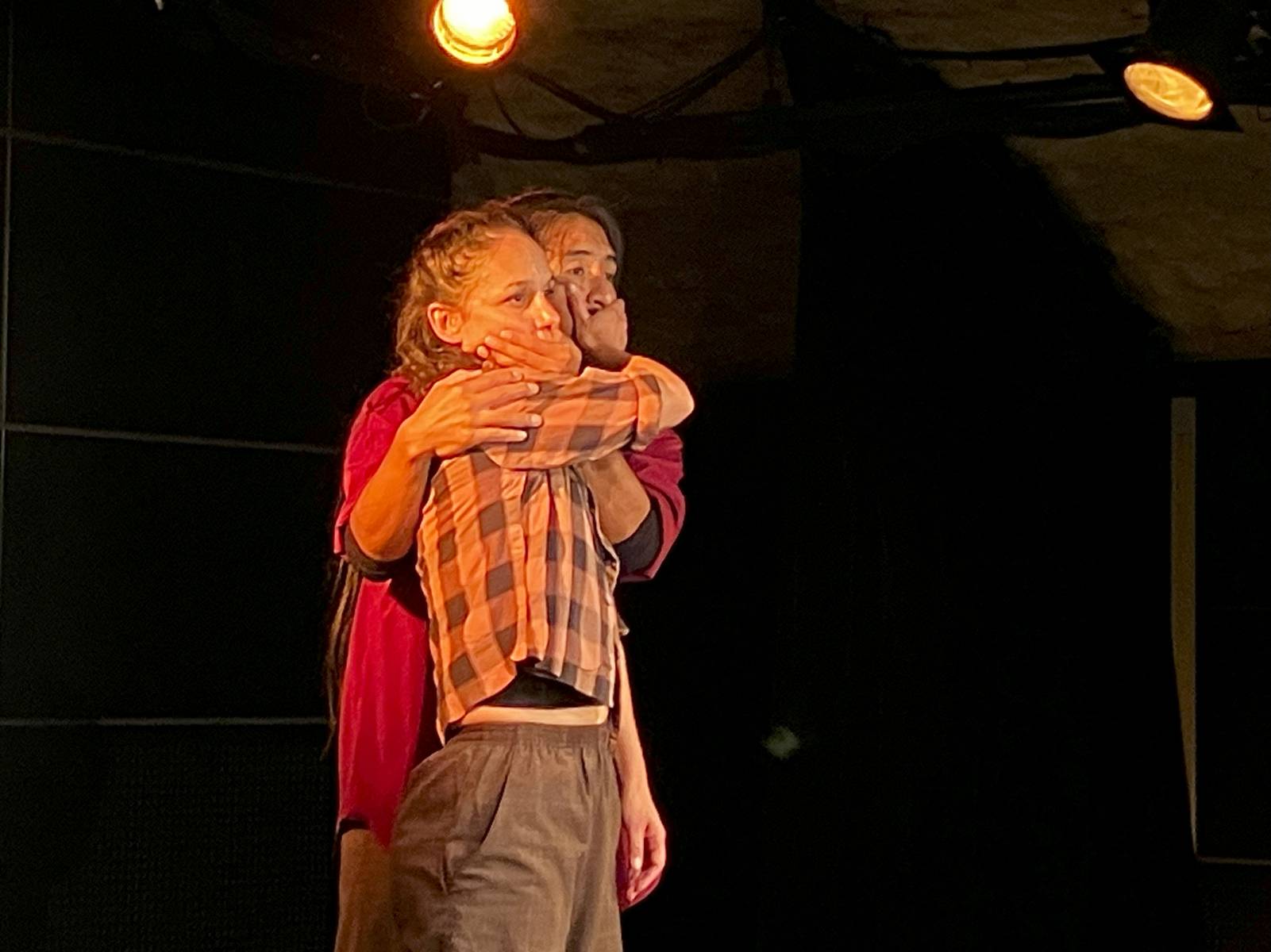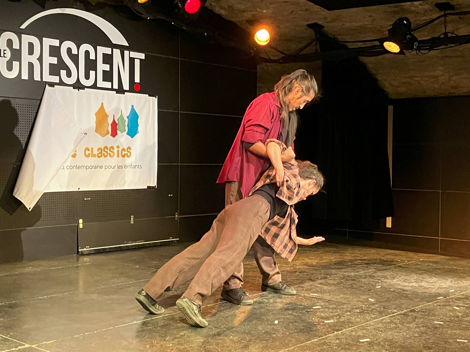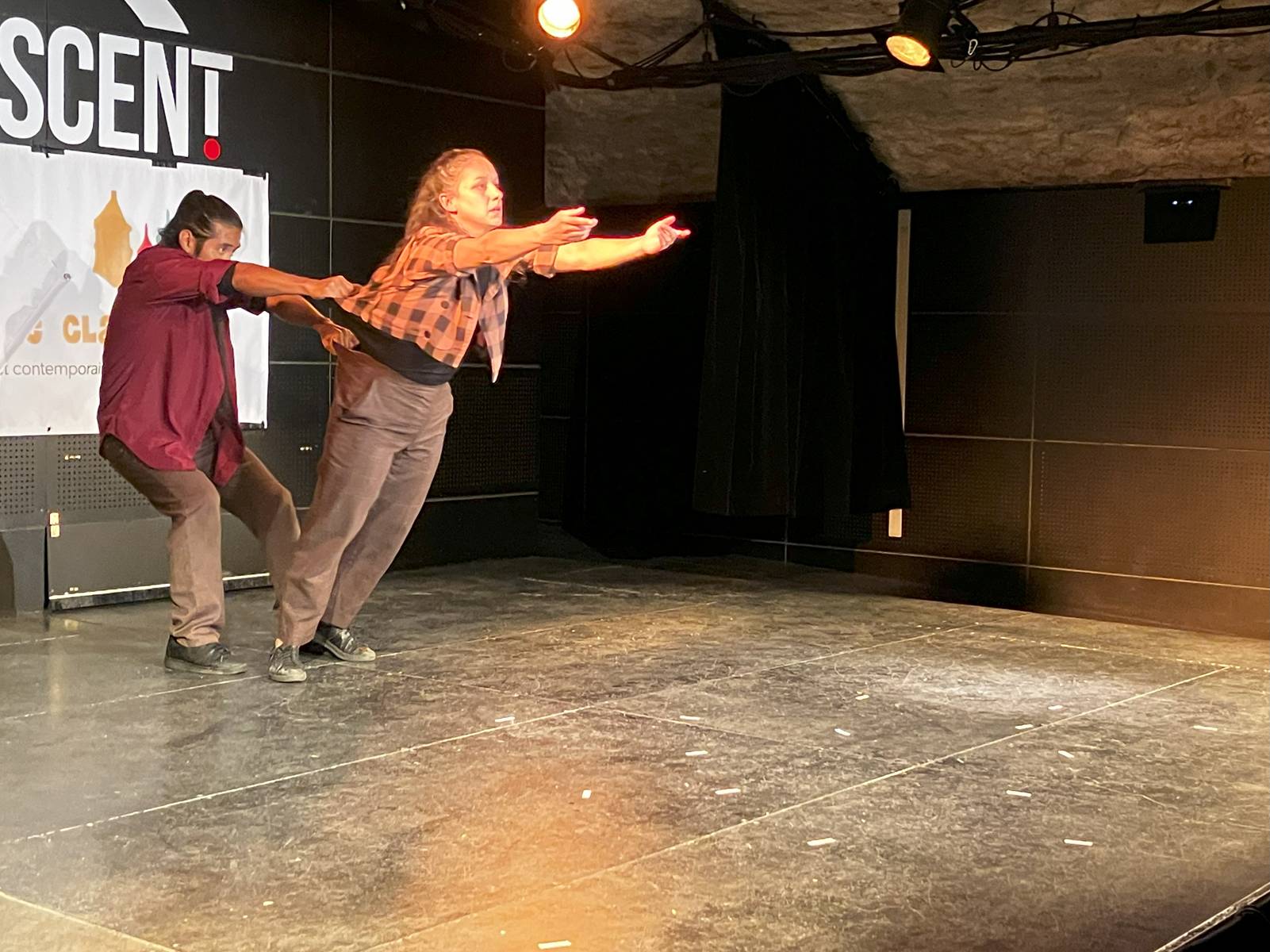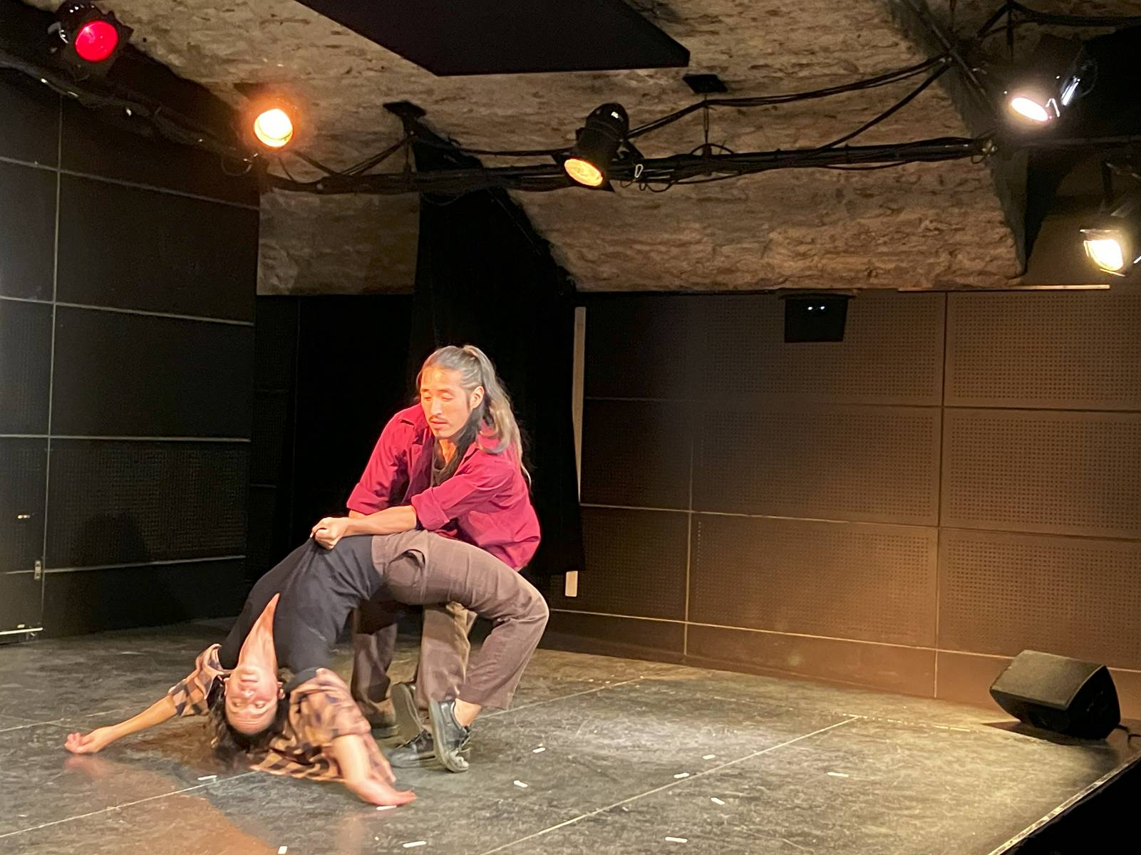 Le spectacle s’est poursuivi avec une démonstration de capoeira, une pratique afro-brésilienne mêlant danse et combat d’art martiaux. Le jeune couple de danseurs a pris place parmi le public, tandis qu’un silence et une certaine tension s’élevaient dans la salle. Le public, tenu en haleine, était en attente d’un signe marquant le début du spectacle, moins reconnaissable. Tout l’espace de la salle était utilisée par les chorégraphes, se recroquevillant dans les alcôves ou frappant légèrement sur les murs. Une fois sur la scène, le rythme s’amplifie, tant dans la musique que dans les mouvements. Les danseurs se portent, puis se jettent au sol. Ils se bousculent, s’entrechoquent, entre enlacements et immobilisations.