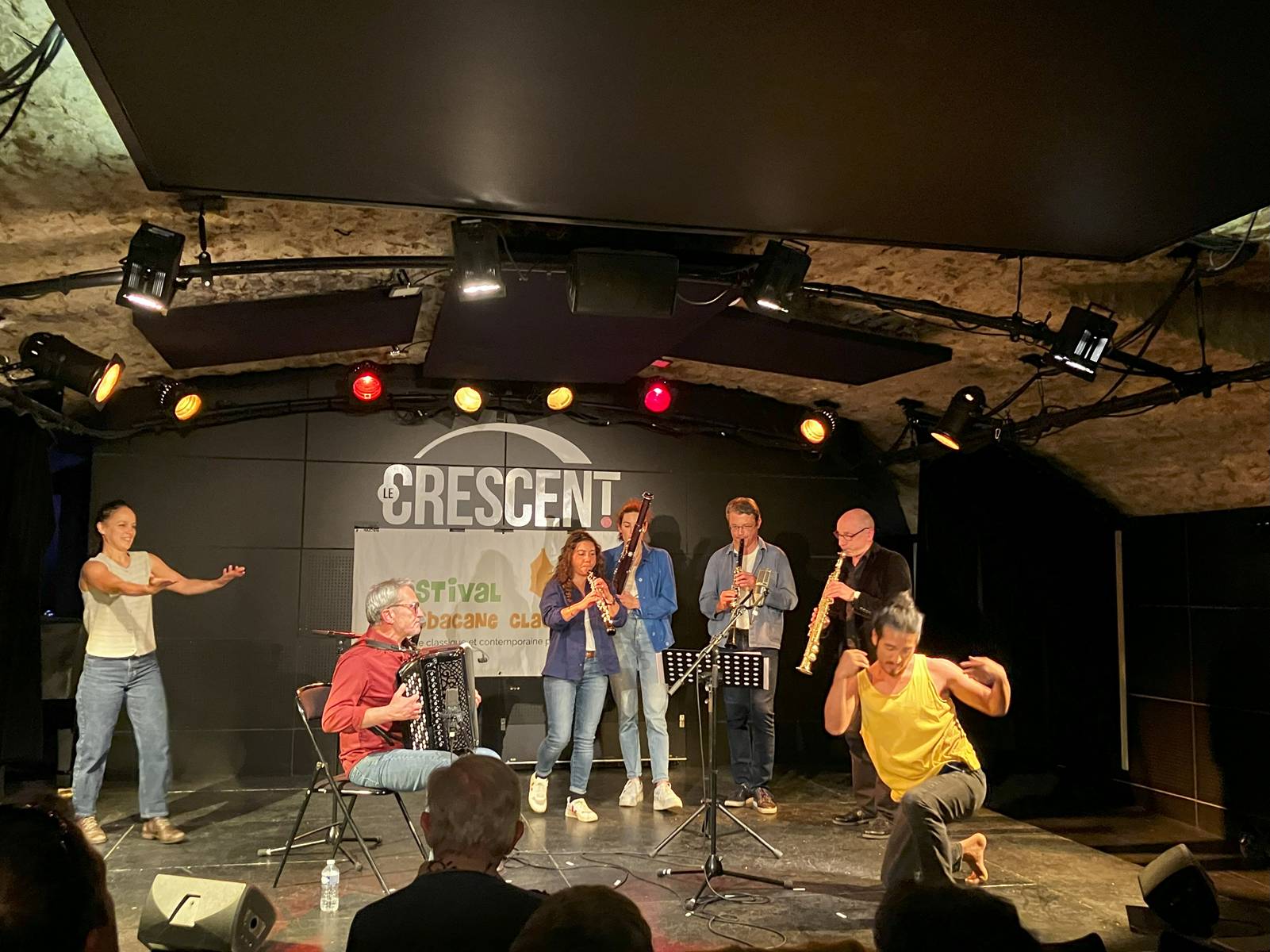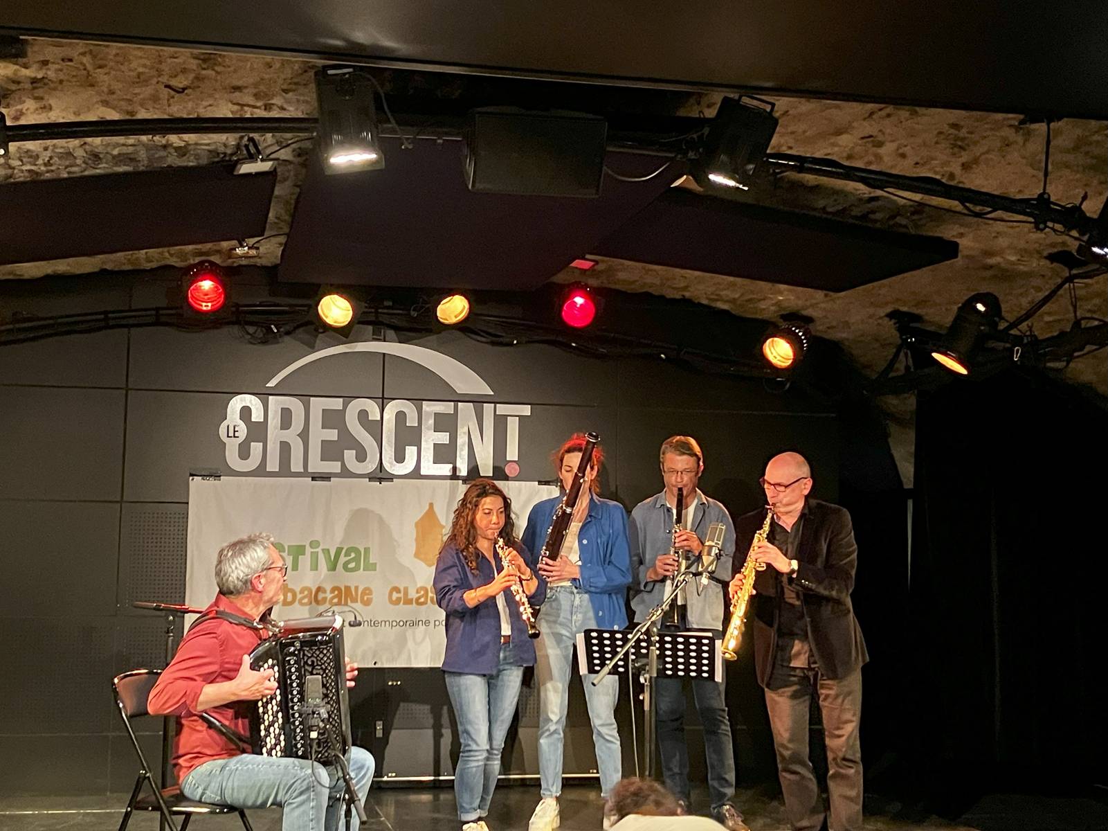 Au total, ce sont 7 artistes qui se sont produits sur la scène du Crescent. La soirée a débuté avec un quintet d’instruments à vent, bien qu’ils ne soient que trois ce soir. Tandis que le rythme s’intensifiaient au fil du concert, les regards et les échanges entre les musiciens ne manquaient pas de marquer leur cohésion. Les instruments semblaient se répondre entre eux. Preuve du succès de cette première présentation, l’un des musiciens a été applaudi en dehors de la scène, revenant parmi le public.