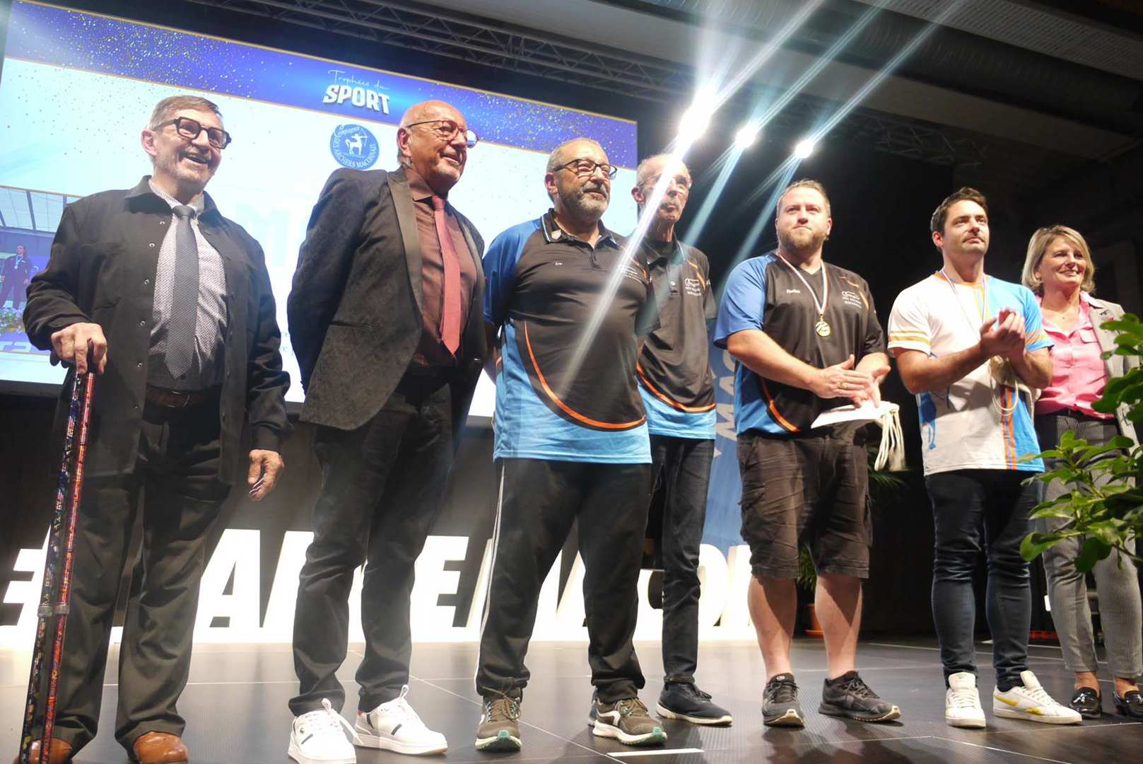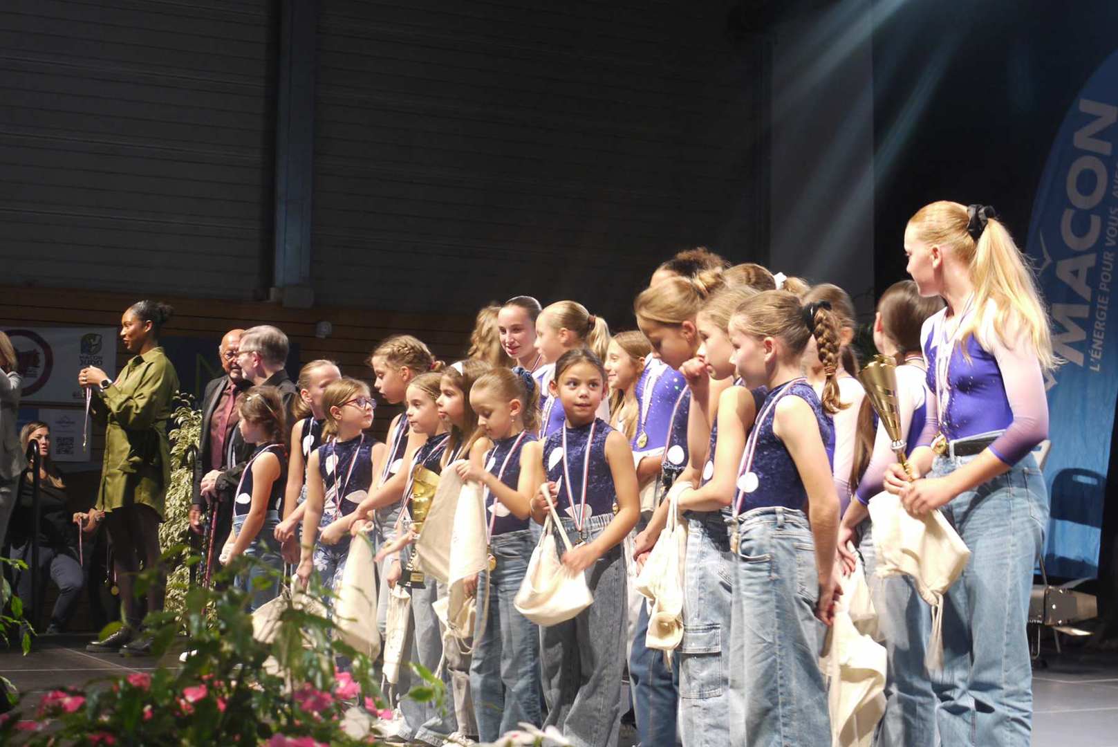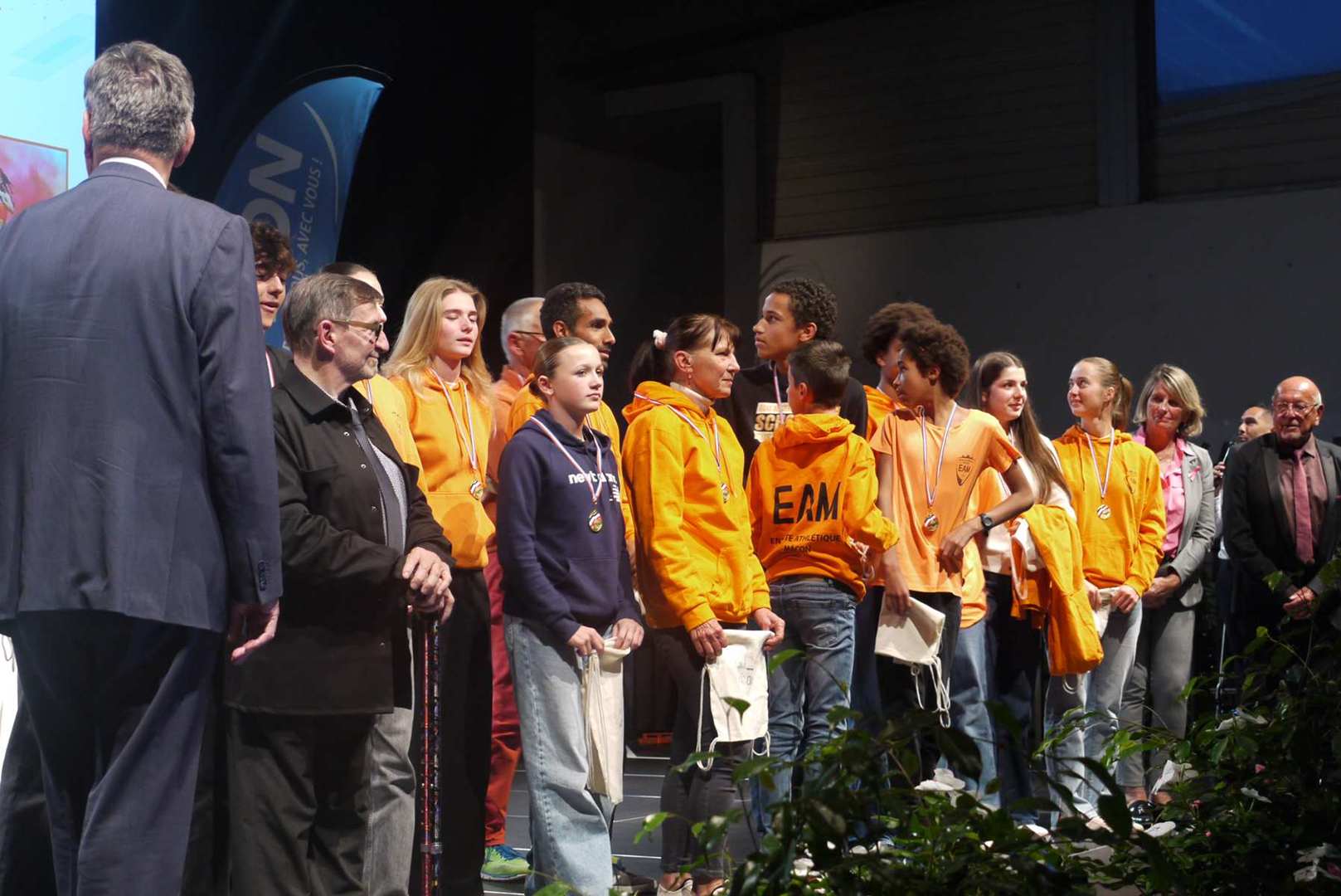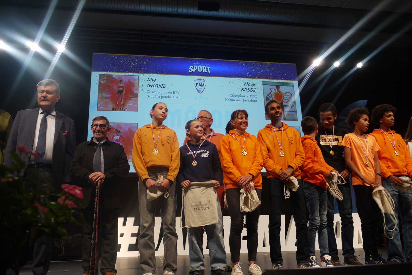 Avant d’entamer la remise des prix, une médaille de la ville est remise à Coraline, après un retour sur ses exploits, marquant ainsi l’honneur de l’avoir invitée pour la cérémonie. Les 22 clubs ou associations sportives ont pu ensuite se succéder sur scène ou leur a été remis médailles et trophées pour récompenser leurs réussites. Sourires et geste de reconnaissances s’enchaînent sur une scène souvent bien remplie par les nombreux sportifs triomphants. Des show de jonglage avec jeux de lumière venaient ponctuer la cérémonie pour le plus grand plaisir du public.