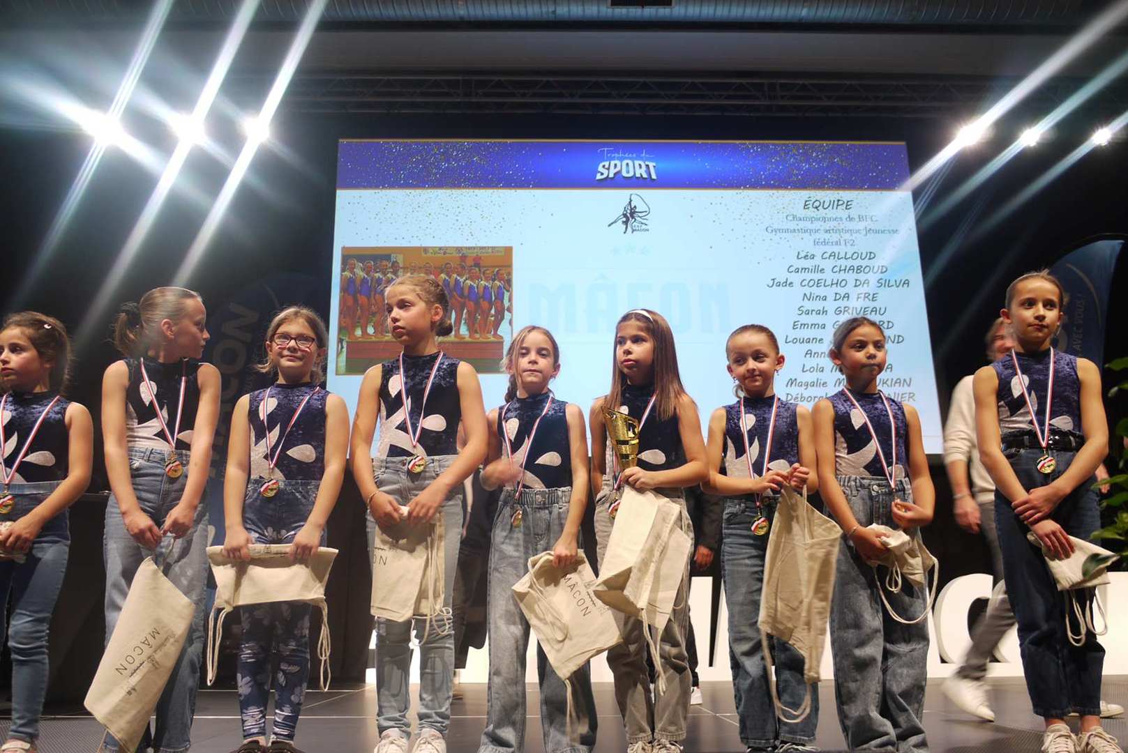 Léa CALLOUD Camille CHABOUD Jade COELHO DA SILVA Nina DA FRE Sarah GRIVEAU Emma GUICHARD Louane JOSSERAND Anna LOREAU Lola MALONGA Magalie MANOUKIAN Déborah MARMONIER Léonie PETIT Leanna PERRAUT : ÉQUIPE Championnes de BFC Gymnastique artistique Jeunesse fédéral F2