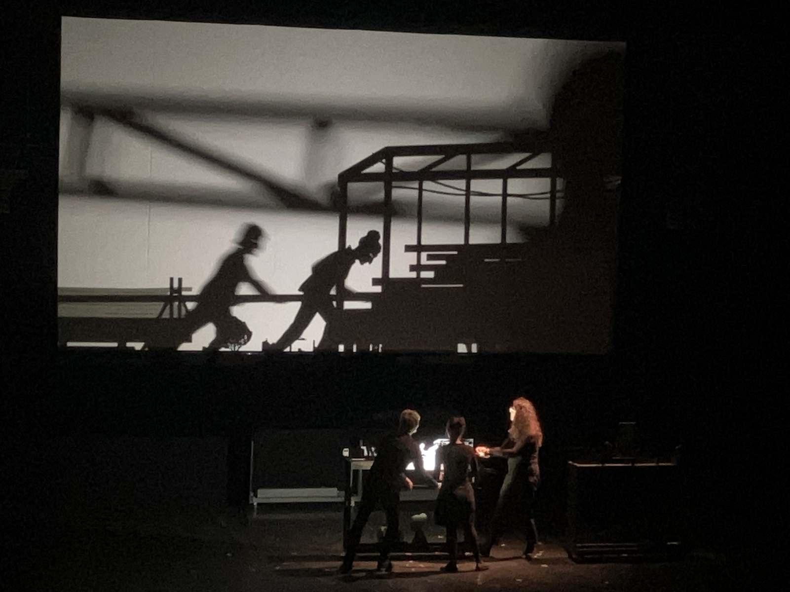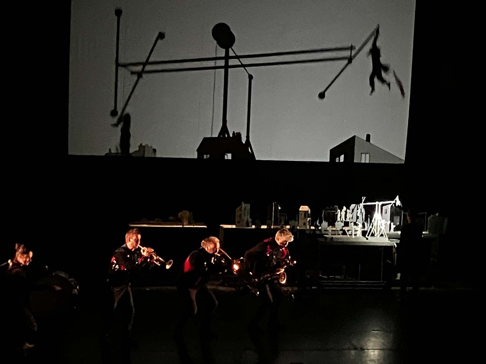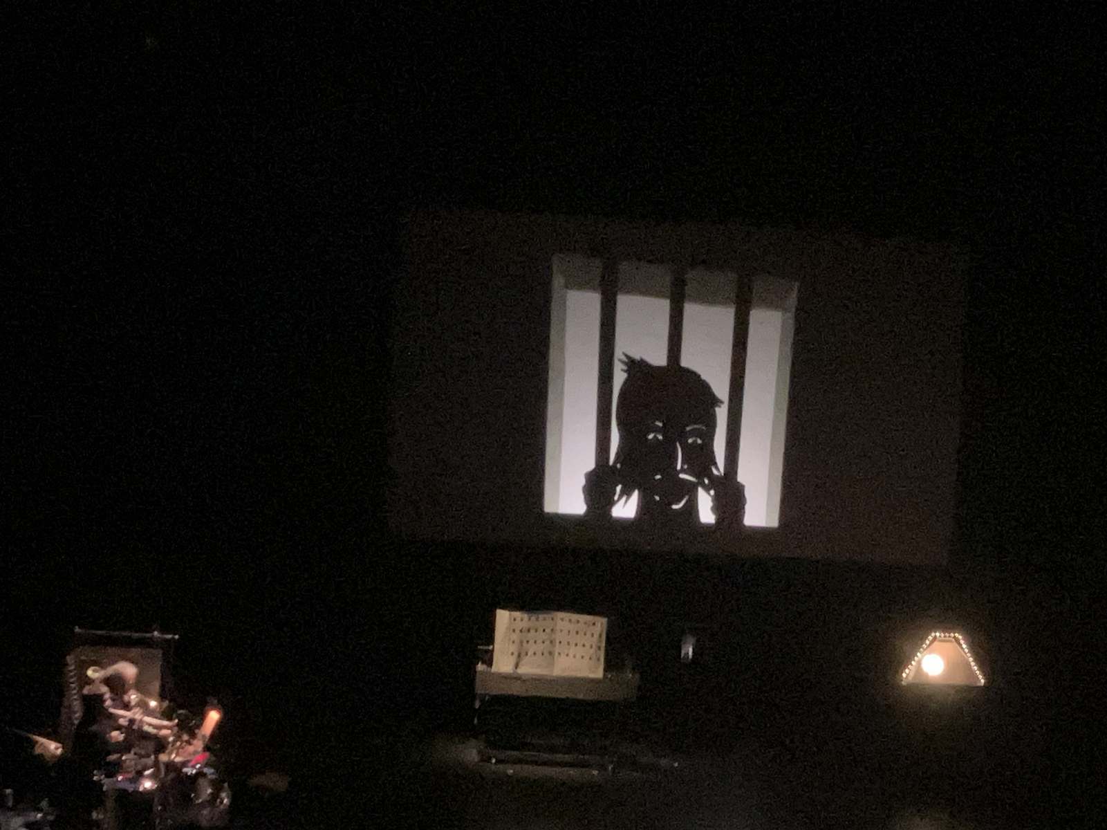 La salle est plongée dans la pénombre et le silence, introduisant l’ambiance sombre à venir. On peut saluer les musiciens jouant en direct sur scène pour la difficulté qui leur est ajoutée avec l’obscurité. Tandis que le public entrevoit les miniatures des décors et des personnages à l’avant de l’écran, ceux-ci sont projetés sur la toile, mettant en lumière le travail des artistes. Pas de paroles, celle-ci sont des imitations produite de façon originale avec les instrument à vent. Les décors glissant sur la scène au fil du spectacle, la rapidité et la dextérité des artistes est évidente. Tandis que la musique est légère au début, accompagné de bruitages, comme par exemple des sirènes brillamment reproduites par les musiciens, elle s’intensifie au cours de la représentation. Les musiciens finissent d’ailleurs par rejoindre la scène à l’avant de l’écran. Les sons sont tantôt amplifiés et coupés brutalement entre chaque scène. L’ambiance oscille entre l’humour et la festivité des spectacles et celle plus sombre de l’emprisonnement.