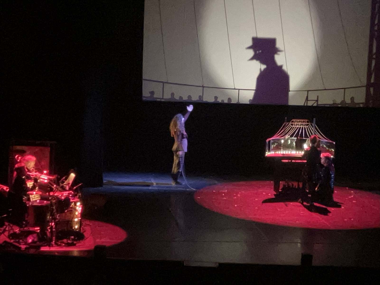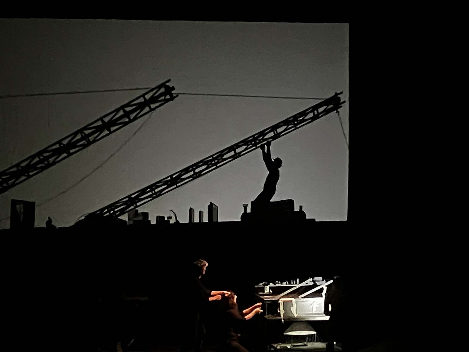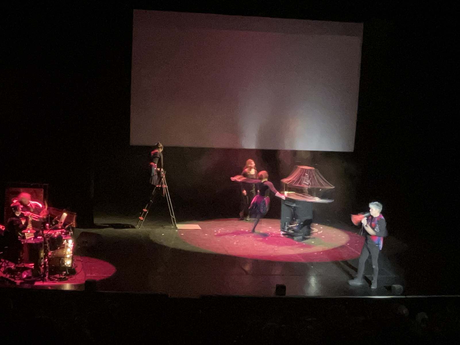 La salle est plongée dans la pénombre et le silence, introduisant l’ambiance sombre à venir. On peut saluer les musiciens jouant en direct sur scène pour la difficulté qui leur est ajoutée avec l’obscurité. Tandis que le public entrevoit les miniatures des décors et des personnages à l’avant de l’écran, ceux-ci sont projetés sur la toile, mettant en lumière le travail des artistes. Pas de paroles, celle-ci sont des imitations produite de façon originale avec les instrument à vent. Les décors glissant sur la scène au fil du spectacle, la rapidité et la dextérité des artistes est évidente. Tandis que la musique est légère au début, accompagné de bruitages, comme par exemple des sirènes brillamment reproduites par les musiciens, elle s’intensifie au cours de la représentation. Les musiciens finissent d’ailleurs par rejoindre la scène à l’avant de l’écran. Les sons sont tantôt amplifiés et coupés brutalement entre chaque scène. L’ambiance oscille entre l’humour et la festivité des spectacles et celle plus sombre de l’emprisonnement.