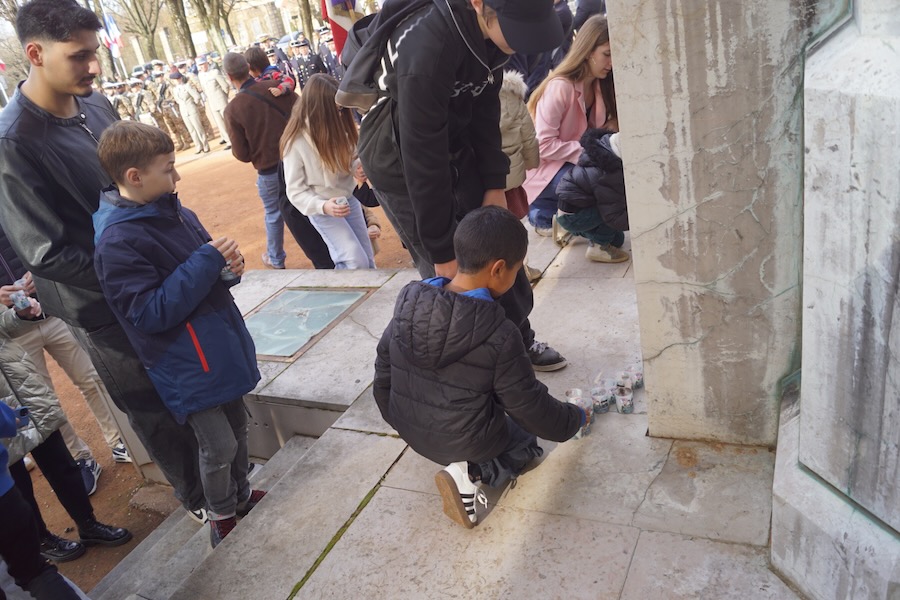Les élèves du lycée Alexandre Dumaine, du collège Schuman et de l’école Jeanne D’Arc ont ensuite déposé les flammes de l’espoir au pied du monument aux morts avant le dépôt des gerbes par les autorités.