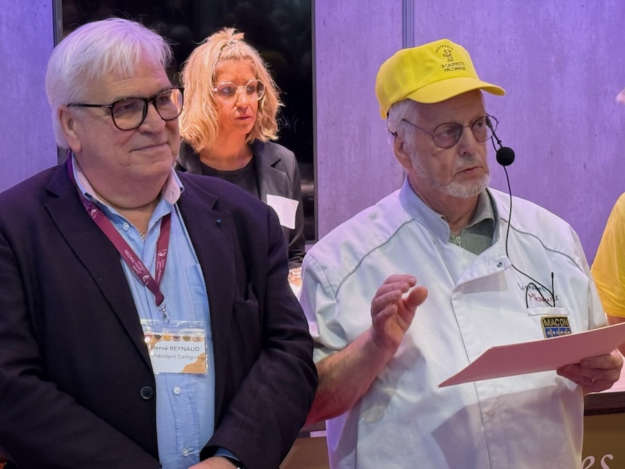 Dans les dernières minutes du concours, Jean-Patrick Courtois, le maire de Mâcon, et Hervé Reynaud, son adjoint à la culture, observent attentivement les candidat.es, témoignant de l’importance patrimoniale de cette spécialité mâconnaise.