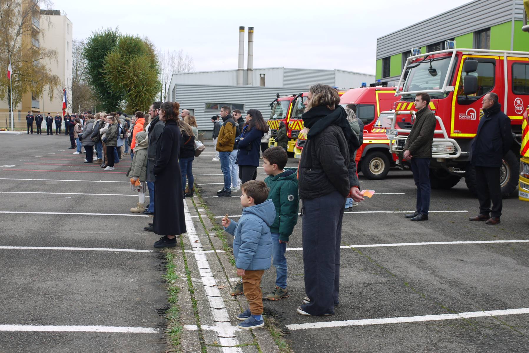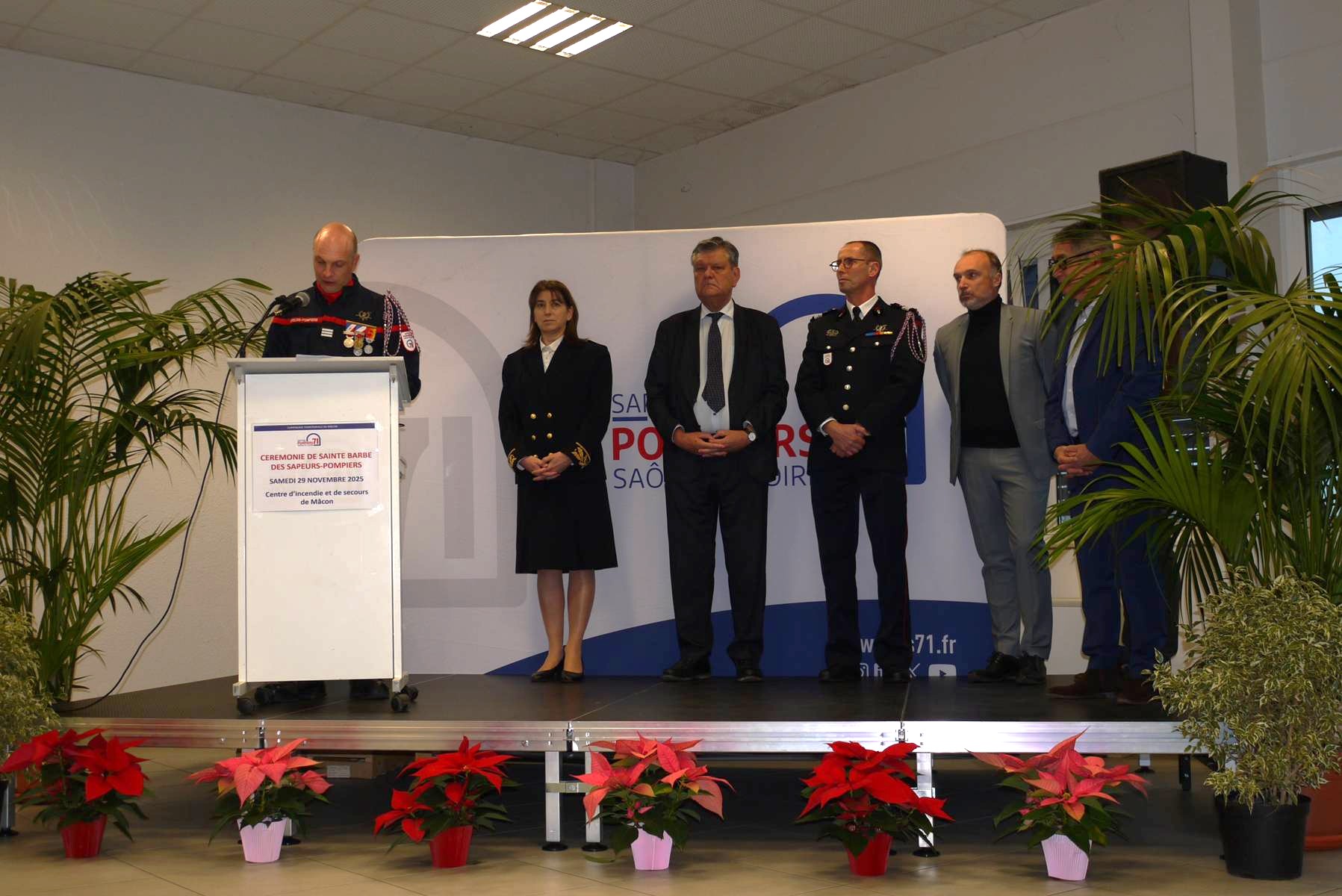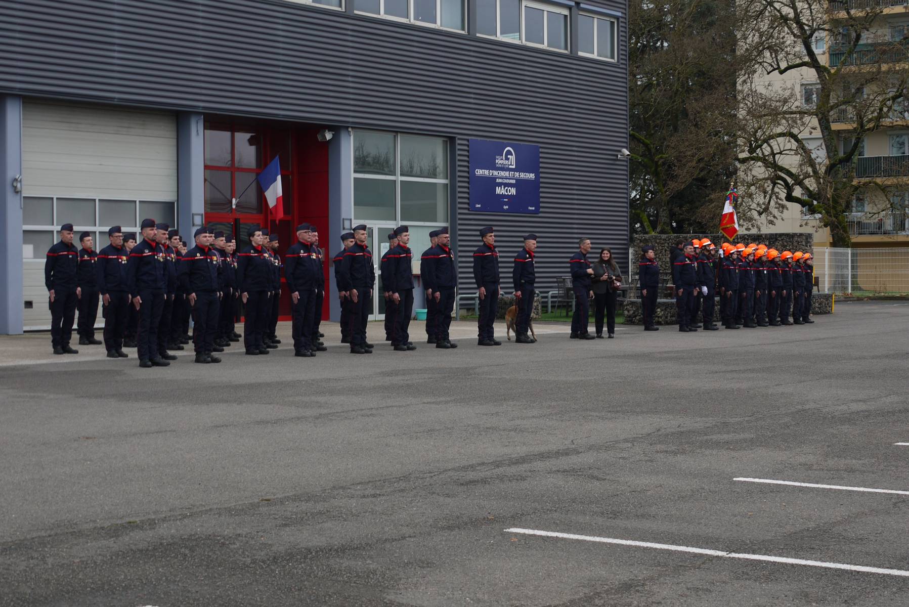C’est dans un grand sérieux que la cérémonie s’est tout d’abord tenue sur le parking du centre de secours. Les sapeurs-pompiers, en présence de M. le maire Jean-Patrick Courtois ainsi que de la sous-préfète Agnès Chavanon, du maire de Sancé, Gilles Jondet, et du député Benjamin Dirx, se sont placés au garde à vous respectueux, sous les yeux attentifs des familles et amis des professionnels en uniforme. Tous ont été ensuite conviés à se rassembler au sein du bâtiment à l’étage afin d’assister à la remise des médailles et de poursuivre la commémoration.