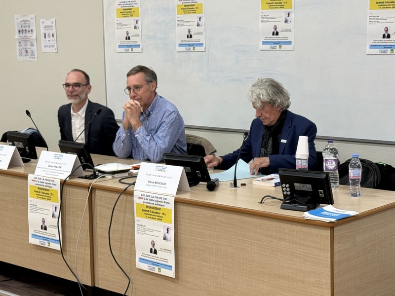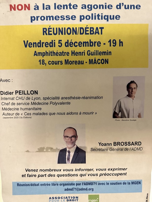 Ce vendredi 5 décembre, c’est devant près de 50 personnes réunies en l'amphithéâtre Guillemin, que Jacques Boucaud, Délégué départemental 71 de l’ Association pour le Droit de Mourir dans la Dignité (l’ADMD), accompagné de Yoann Brossard secrétaire général de l’ADMD, accueillait le docteur Didier Peillon, auteur de « Ces malades que nous aidons à mourir ».