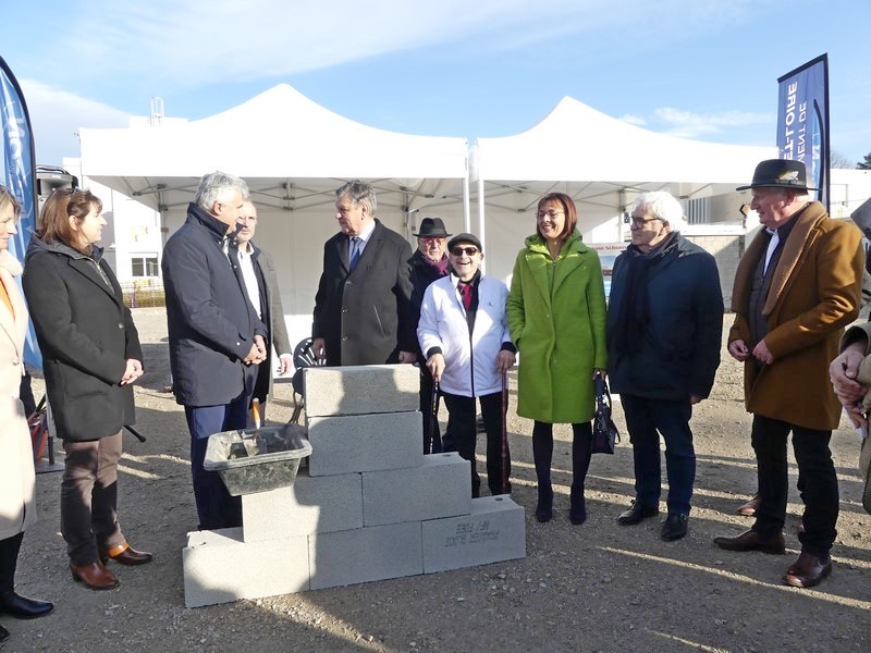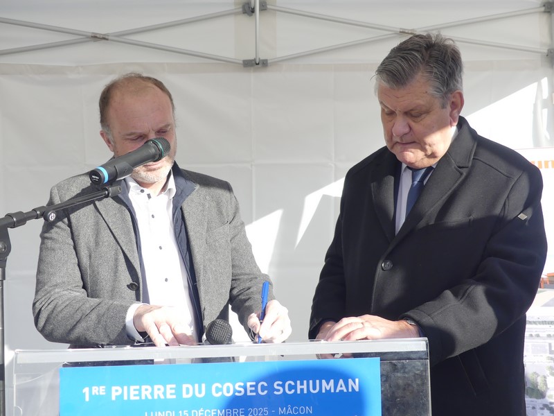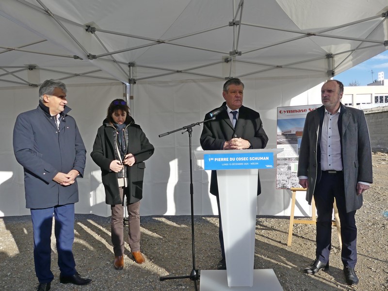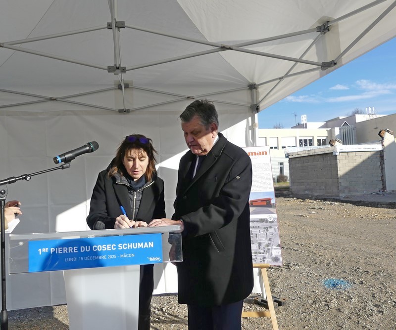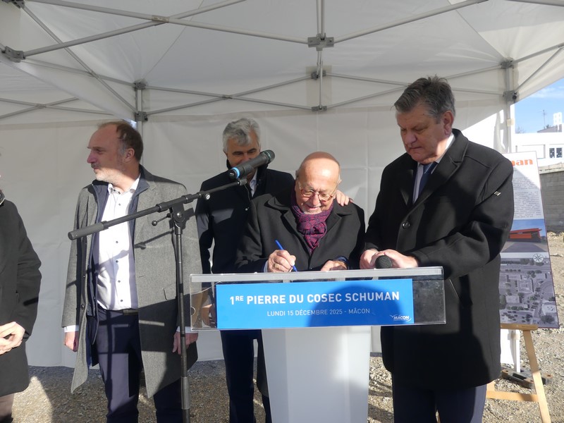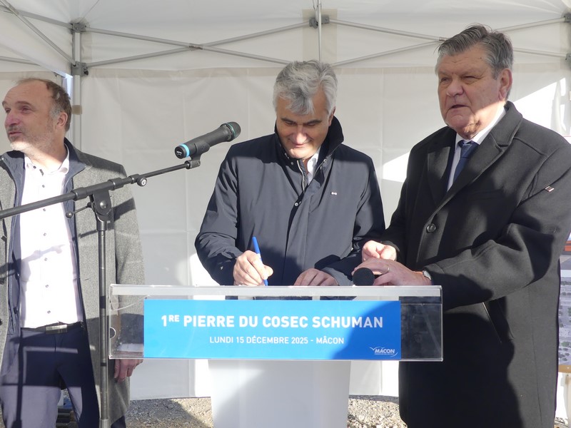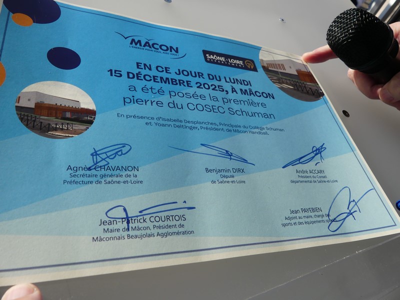 C'est sur le chantier du futur Cosec Schuman qu'avaient rendez-vous ce lundi 15 décembre, les élu.es du territoire, la secrétaire Générale de la Préfecture de Saône-et-Loire et les représentants des entreprises, pour la pose de la 1ère pierre du Cosec Schuman en présence de la principale Isabelle Desplanches et du président de Mâcon Handball Yoann Deltinger.