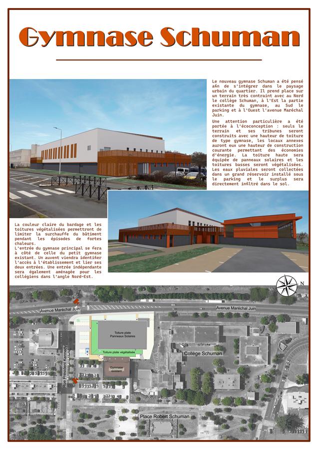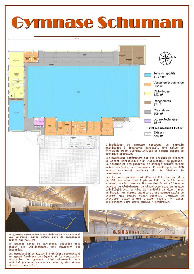Le bâtiment disposera d'une isolation phonique améliorée et d'équipements de très haute qualité qui permettront au club de Handball et aux équipes du collège Schuman de bénéficier de vestiaires, de salle de réunion. Un club house pour le Hand sera divisé en deux grâce à une cloison mobile pour permettre l'accès à une grande salle de réunion.