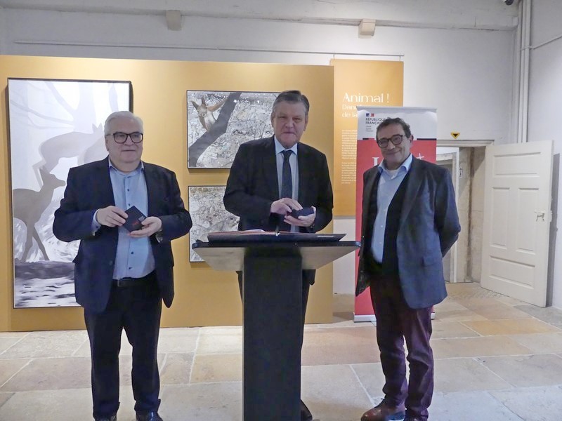Après la signature de la convention 2025-2028, afin de marquer symboliquement la qualité et la constance du partenariat, le directeur régional a remis au maire et à son adjoint à la culture et au patrimoine Hervé Reynaud, la médaille de l'Inrap.