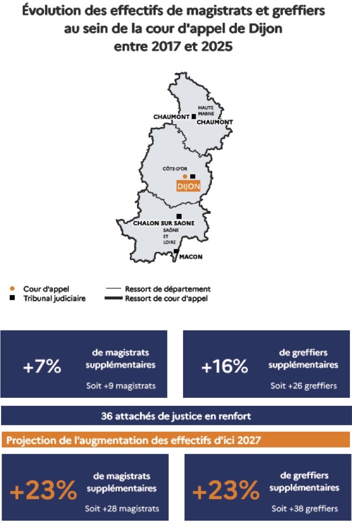 La loi d’orientation et de programmation 2023-2027 du ministère de la Justice prévoit le recrutement en France de 1 500 magistrats, 1 800 greffiers et 1 100 attachés de justice sur la période 2023-2027. Les augmentations d'effectifs atteindront +38 % de magistrats et +32 % de greffiers au tribunal judiciaire de Mâcon annonce le ministère de la Justice.