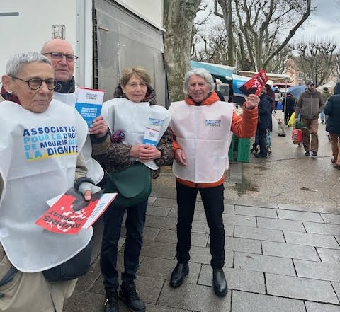 Une dizaine d'adhérents, parmi les 600 que compte l’Association pour le Droit de Mourir dans la Dignité en Saône-et-Loire, étaient présents samedi matin sur le marché de Mâcon. Il s’agissait pour eux de rappeler aux acheteurs ou visiteurs l’importance de la discussion par l’Assemblée nationale en deuxième lecture, à partir du 16 février, sur la proposition de loi relative à la fin de vie. Cette loi a été été rejettée par le Sénat le 28 janvier, après une semaine de débats chaotiques anéantissant tous les progrès souhaités par une large majorité de Français.