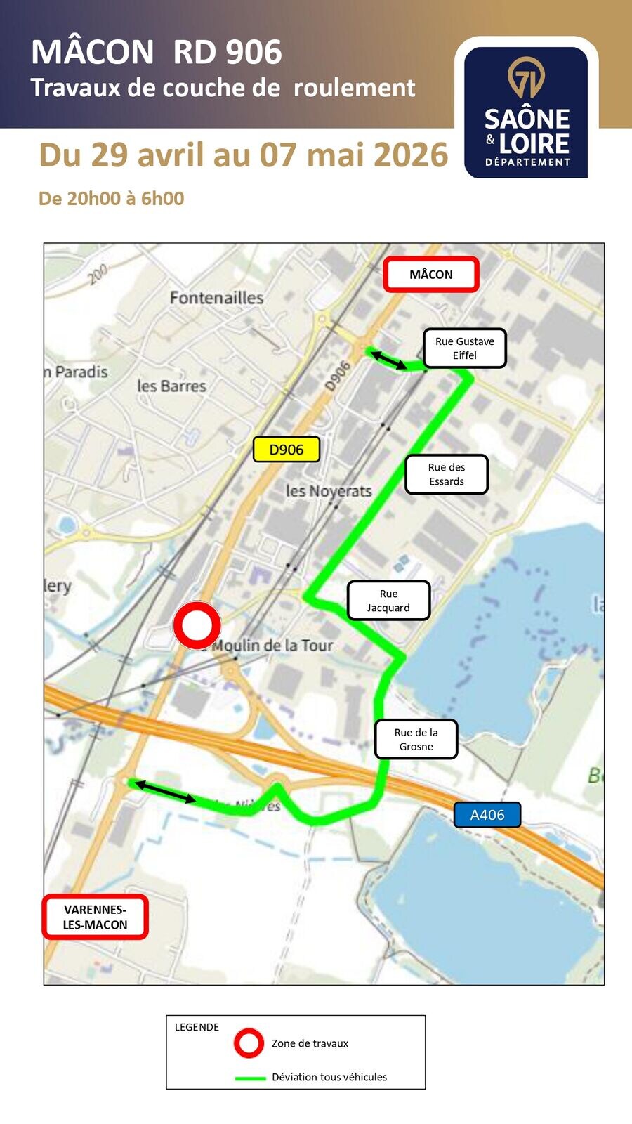 Conscient de la gêne occasionnée, le Département de Saône-et-Loire met tout en œuvre pour limiter la durée des travaux. Afin de garantir la sécurité des équipes sur le chantier, il est demandé aux usagers de respecter la signalisation temporaire et de suivre les itinéraires de déviation mis en place en amont.