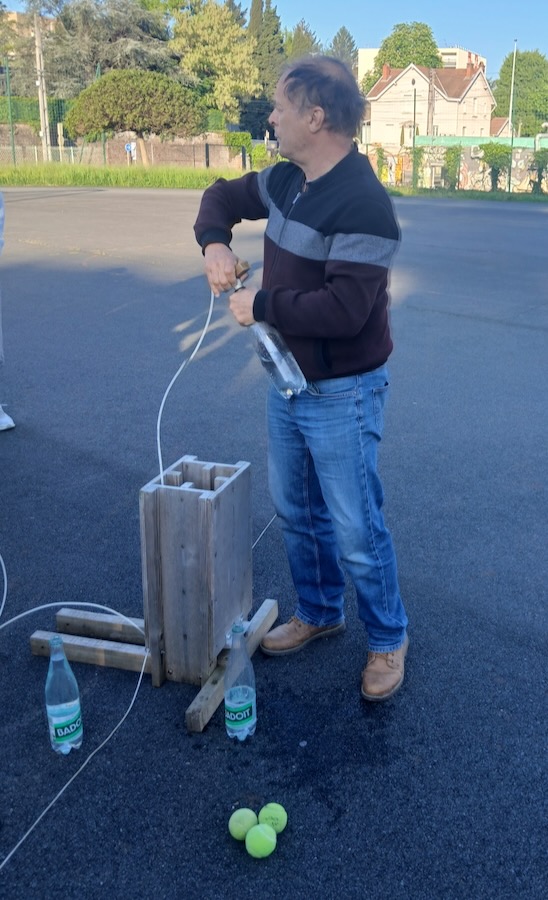 « Après avoir rempli le réservoir d’un tiers d’eau, il s’agit d’insérer le bouchon et de mettre la fusée sur sa rampe. Il ne reste plus qu’à pomper jusqu’à ce que la pression à l’intérieur de la bouteille devienne suffisante pour faire partir le bouchon : la pression est telle que le bouchon est éjecté avec la masse d’eau contenue dans la bouteille. Le manomètre de la pompe permet de se rendre compte de la pression dans la bouteille : les 5 bars sont atteints sans difficulté. »