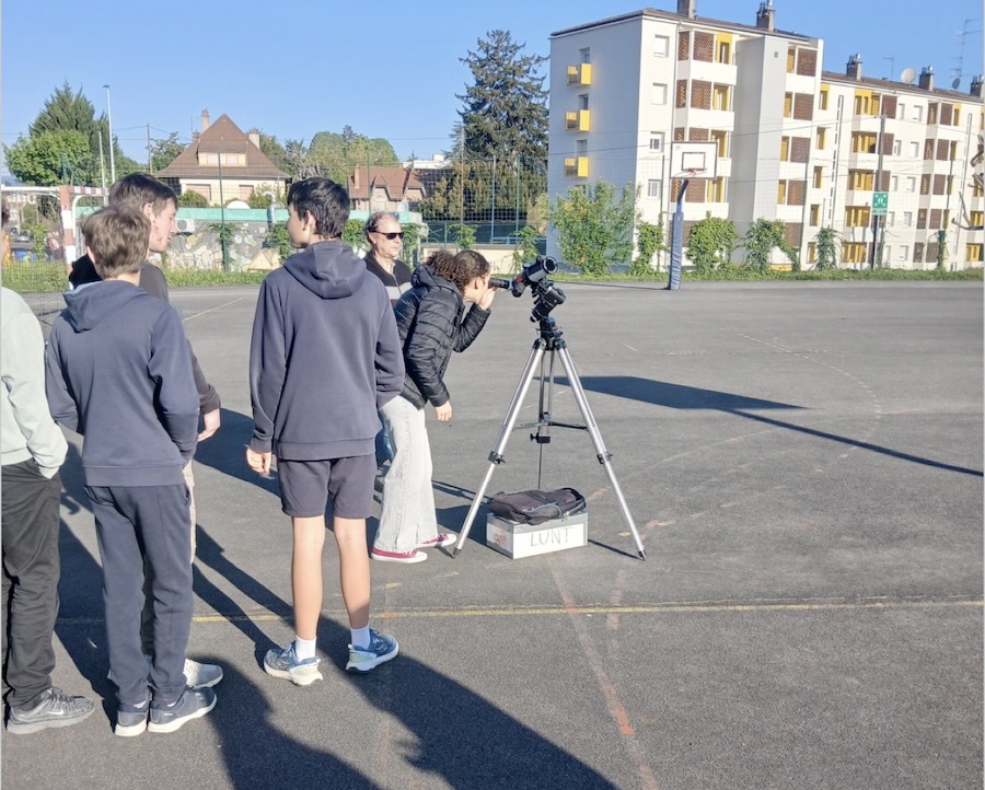 Dans un second temps, les collégiens ont observé notre étoile à partir d’une lunette solaire. Les tâches sombres constituent les parties les moins chaudes du Soleil, qu’on estime à 5 000°C tout de même ! Les protubérances ou éruptions solaires ont pu également être constatées.