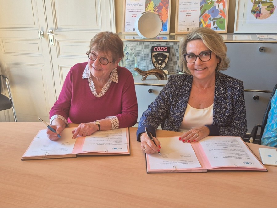 En présence d'Aurélie Lambert, responsable du CCAS, de Marie-Thérèse Thomas, adjointe en charge des Solidarités et de l'Action sociale, et de Françoise Besson, élue au Conseil municipal, la convention de partenariat a été officiellement signée pour une durée de trois ans par Christine Robin, maire de Charnay-lès-Mâcon et présidente du CCAS, et Marie-Claire Lanoizelée, engagée dans le bénévolat pour France Alzheimer.