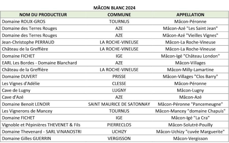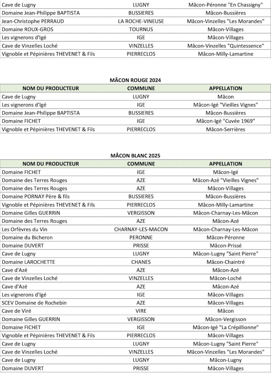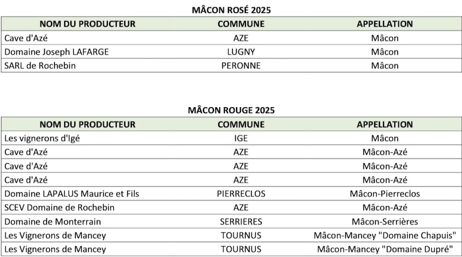 Voici la liste par jury des entreprises dont la(les) cuvée(s) a(ont) été distinguée(s) lors de la distinction Saint-Vincent des vins Mâcon du 19 mars 2026 :