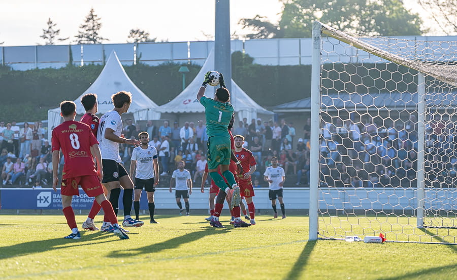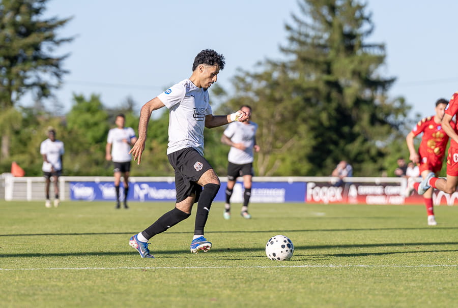Avec une météo estivale et une pelouse toujours aussi bien entretenue par les jardiniers de la Ville de Mâcon, les préfectoraux enregistrent le retour de leur maître à jouer, Timothée Taufflieb, absent lors du match nul face à Vierzon la semaine passée. Un retour qui fait la différence rapidement puisque le meneur de jeu mâconnais ouvre le score en taclant aux 6 mètres, bien servi par El Hassani (19’). Suite à ce but, gros temps fort pour Mâcon 71 qui se procure plusieurs occasions de faire le break en 5 minutes mais sans réussite. Le match va ensuite se poursuivre dans un faux rythme jusqu’à ce que l’ailier droit mâconnais Hitouss trouve la barre avant la mi-temps, score à la pause, 1-0.