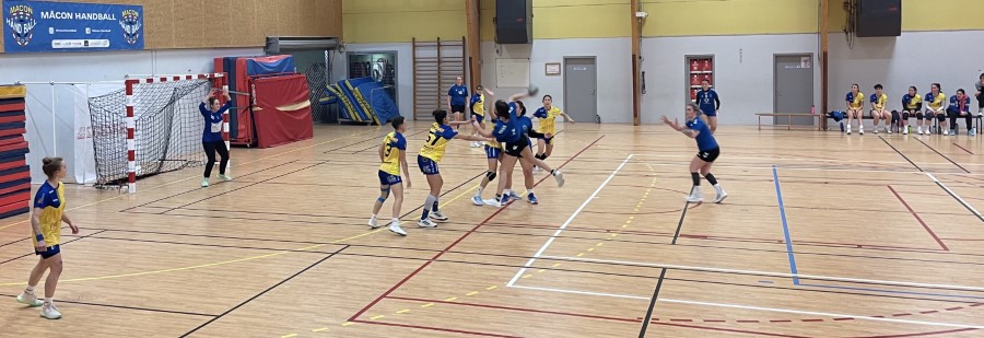 Après la surprenante défaite de la semaine dernière à Arnay-le-Duc (25-16), qui leur fait perdre la tête du championnat, les filles de Sandrine Panier se devaient de réussir face à Marsannay classé en milieu de tableau. Mission réussie d'une fort belle manière. Les Jaunes et bleues sont restées appliquées durent les 60 minutes malgré un premier but des visiteuses, Mâcon fait la course en tête, comptant même un +10 à la 52ème minute grâce à un jet de 7m réussi de Lola Crépaud. Victoire de Mâcon 32-26 (MT 13-8). Avec les victoires de ses concurrents directs, Mâcon conserve sa 3ème place au championnat prénational.